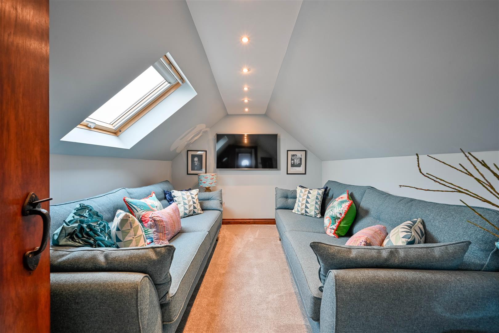 Fitted carpet, inset spotlighting, and a skylight. It is currently used as a snug room.