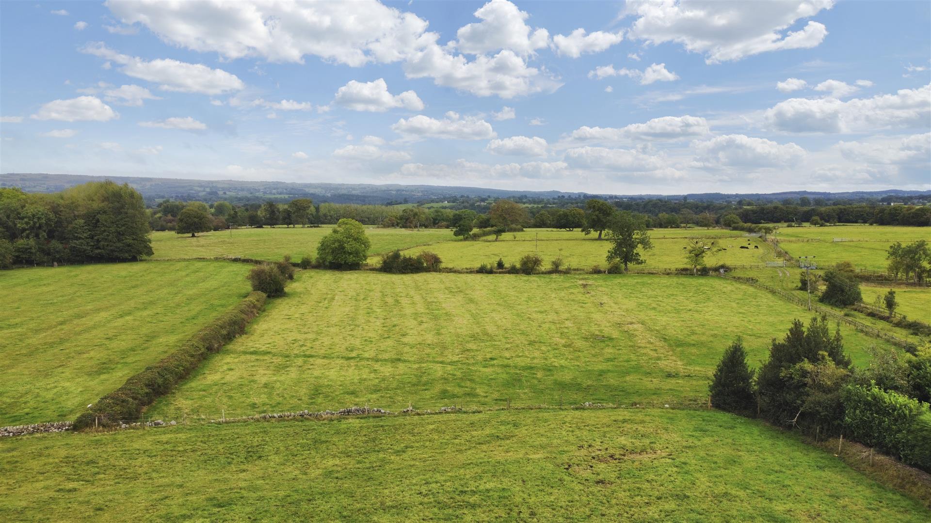 The rear garden is a lovely feature, with cobbled-style paths and patio areas that create inviting seating spaces. The main garden area, primarily laid to lawn, is bordered by flower beds and additional seating areas, all surrounded by dry stone walling and overlooking open fields.