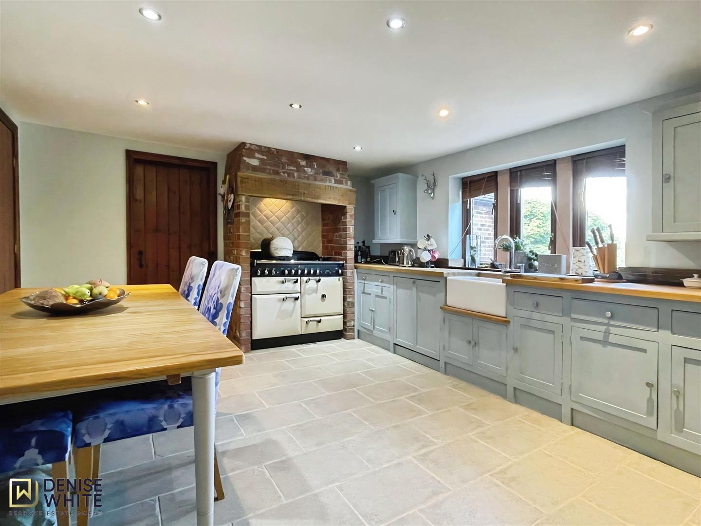 A generously sized breakfast kitchen designed for both culinary adventures and casual gatherings. The continuation of the exposed stone flooring connects the entire space, while an extensive range of wall and base units, complemented by wooden work surfaces, offers a stunning traditional aesthetic. There is a Belfast sink, integrated dishwasher, and range-style cooker set in an exposed brick chimney style breast with a tiled inset, exposed beam and an extractor unit above.