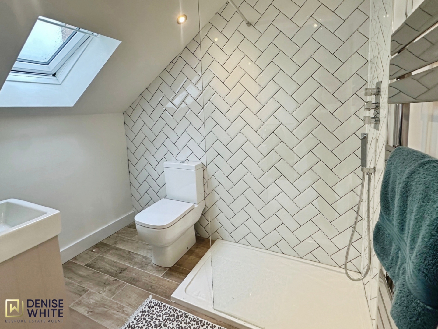 Fitted with a suite comprising of walk-in shower cubicle with rainfall showerhead, low-level WC and vanity wash hand basin unit. Wood effect tiled flooring. Part tiled walls. Wall mounted heated towel rail. Velux window to the rear aspect. Ceiling spotlights.