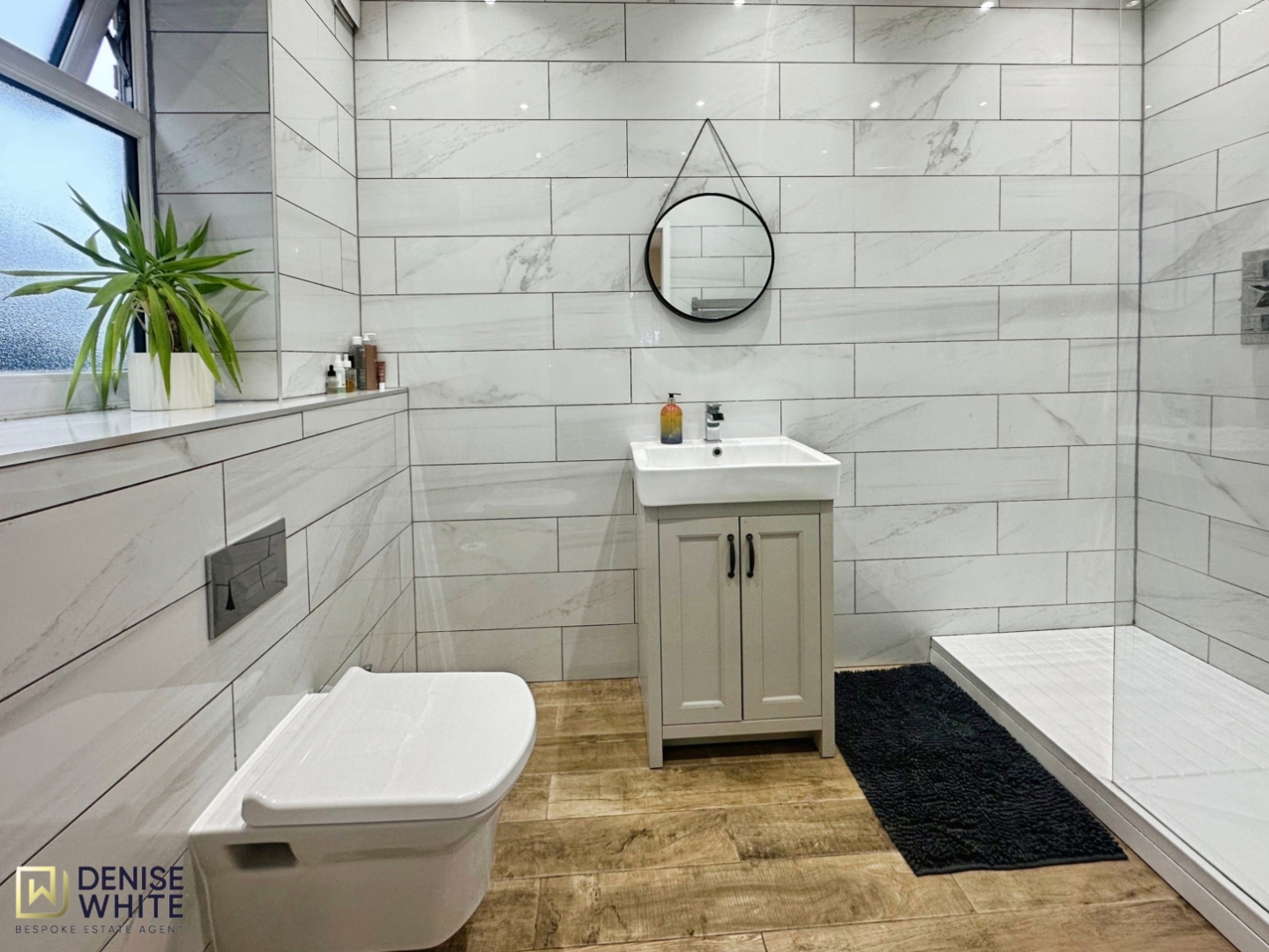 Fitted with a suite comprising of walk-in shower with rainfall showerhead, back to wall WC and vanity wash hand basin unit. Wood effect tiled flooring with underfloor heating. Fully tiled walls. Wall mounted heated towel rail. Obscured uPVC window to the side aspect. Ceiling spotlights.