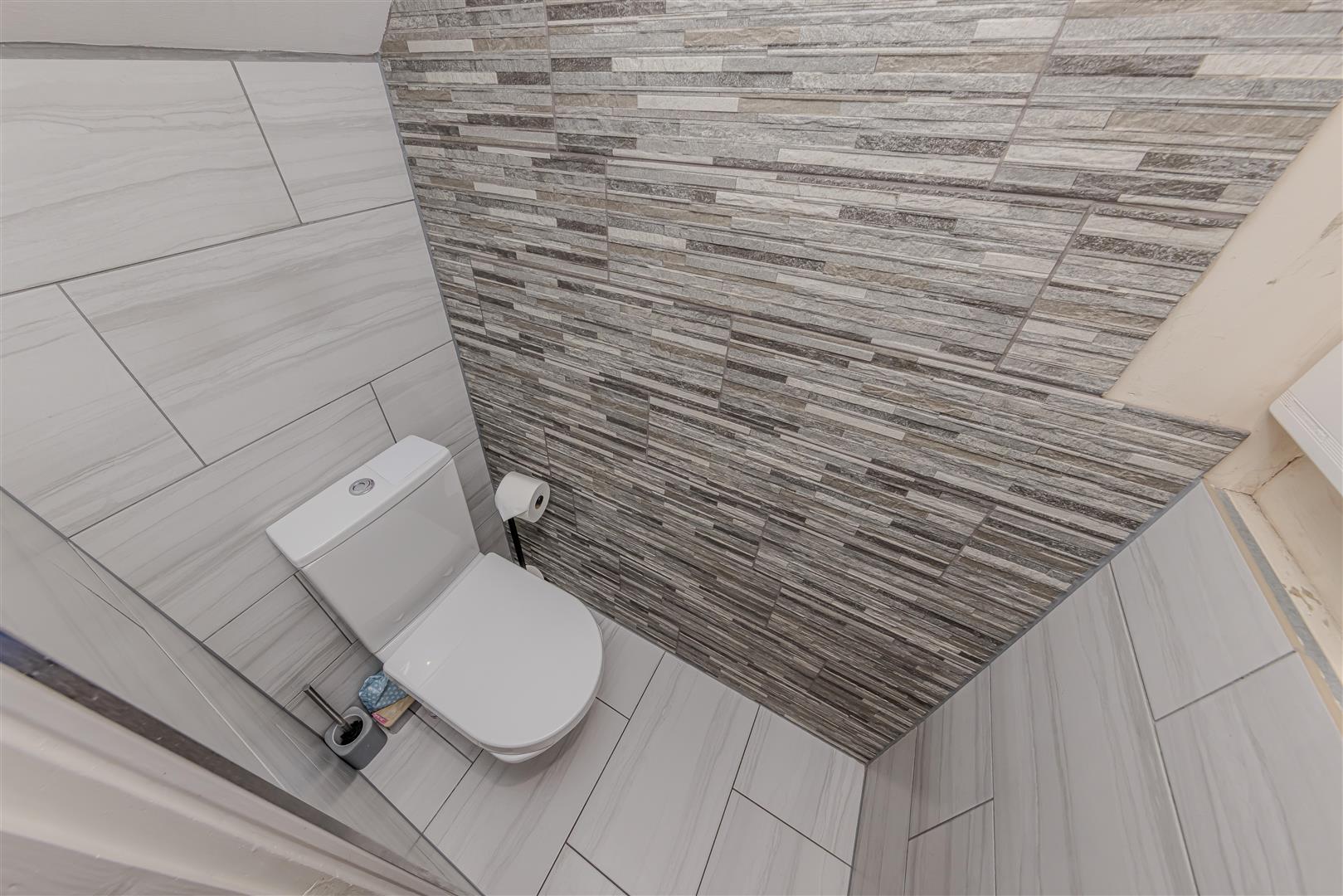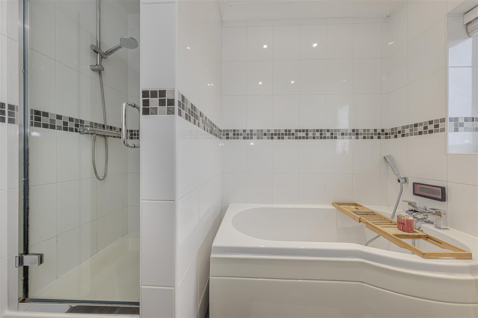 Tiled flooring. WC. Wash hand basin. Bath. Shower cubicle. Obscured UPVC double glazed window. Inset spotlights.