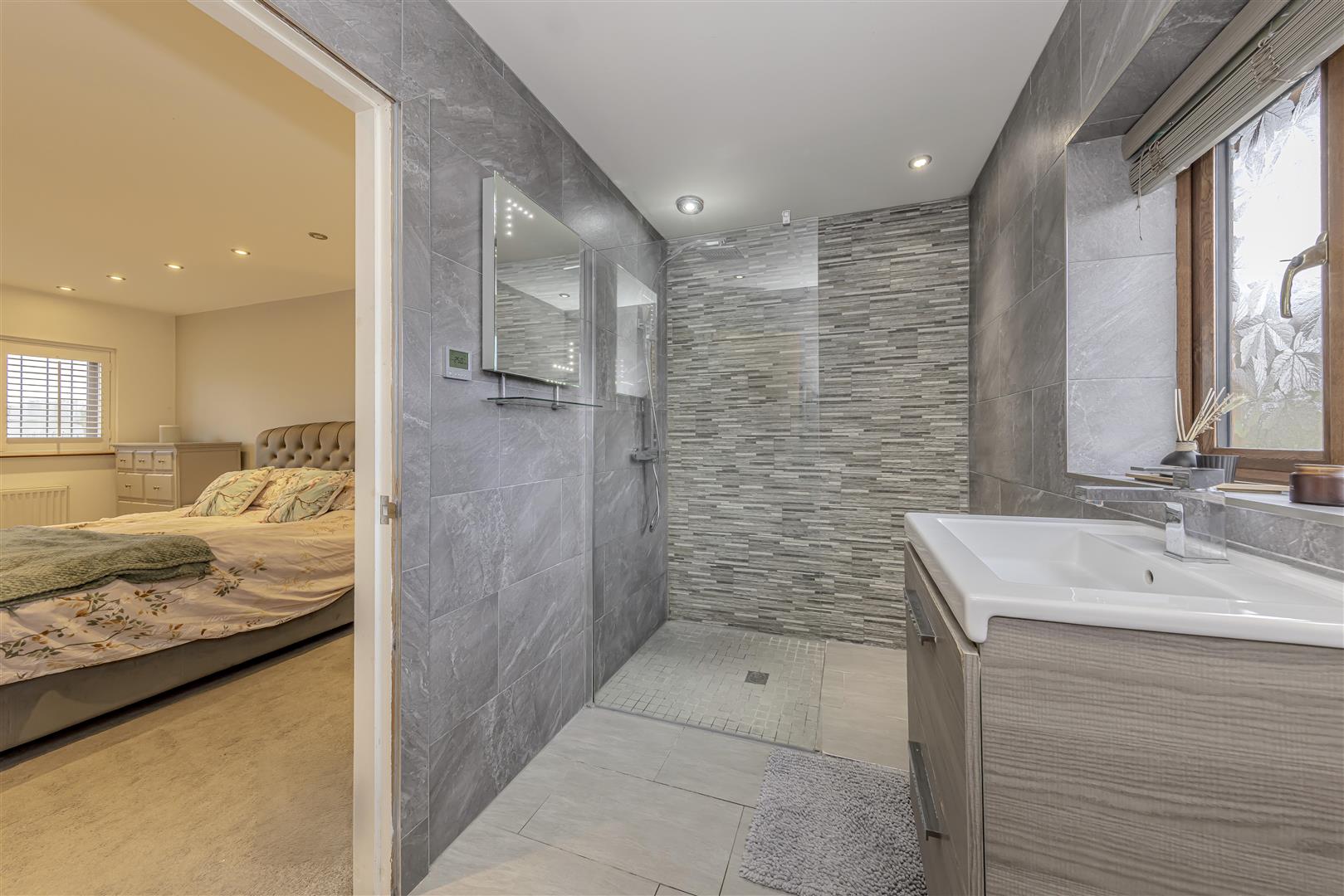 Tiled flooring. WC. Vanity style wash hand basin. Walk-in shower. Rain style shower. Obscured UPVC double glazed window. Inset spotlights.