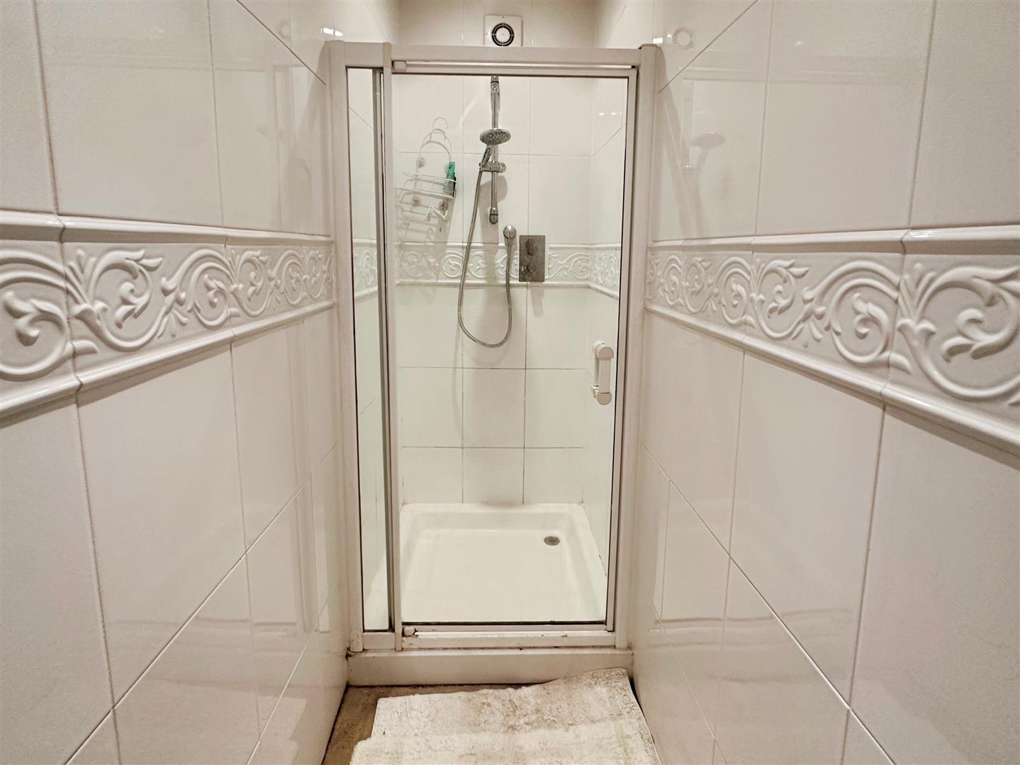 Fully tiled shower cubicle. Fully tiled walls. Carpet. Wall mounted electric heater. Ceiling spotlights.