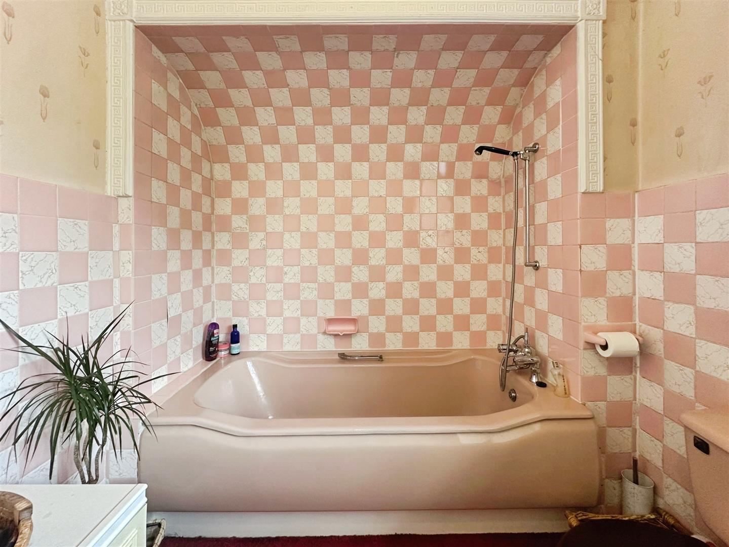 Fitted with a low-level WC and pedestal wash hand basin. Vinyl flooring. Radiator. Obscured sealed unit double glazed window to the rear aspect. Wall light.
