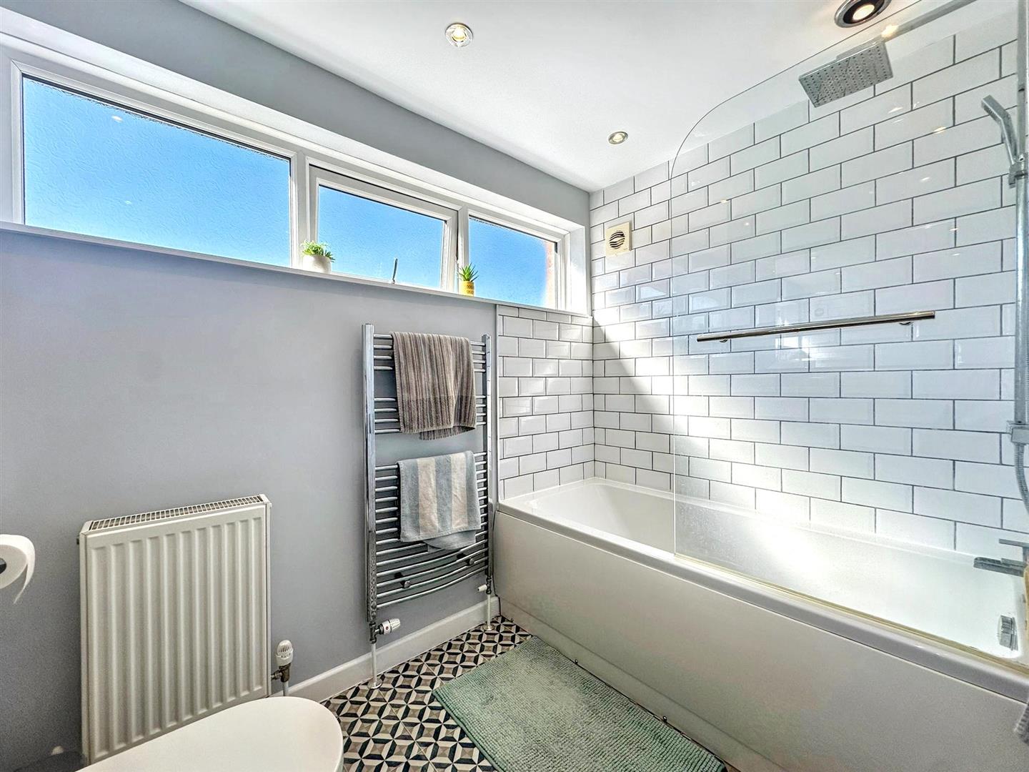 Fitted with a Suite comprising of, low-level WC, vanity wash hand basin, bath with rainfall shower over. Vinyl flooring. Heated towel rail. Radiator. Obscured uPVC window. Inset spotlights.