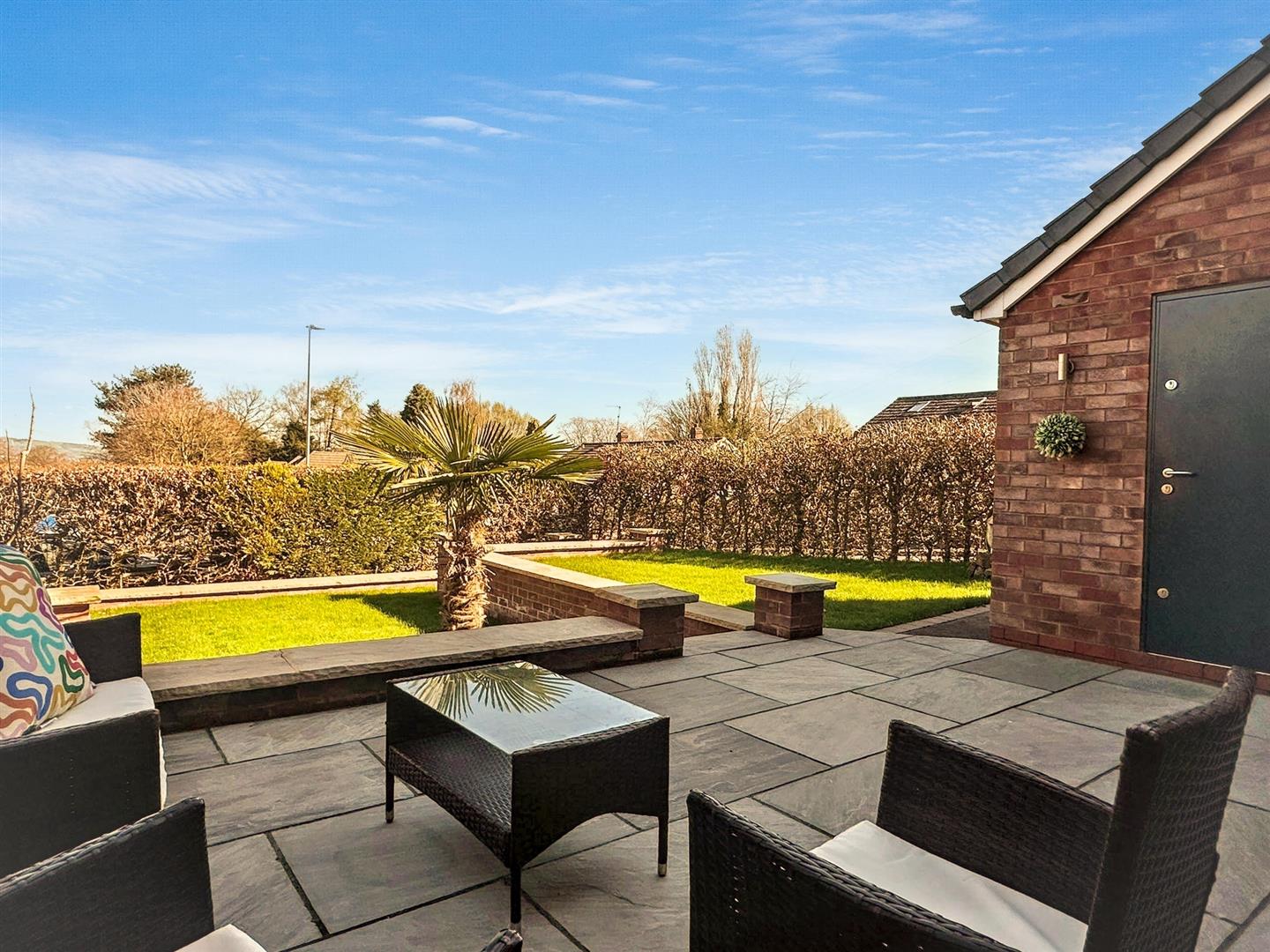The rear garden features a patio area ideal for entertaining, alongside a well-maintained lawn, creating a pleasant outdoor space to enjoy.