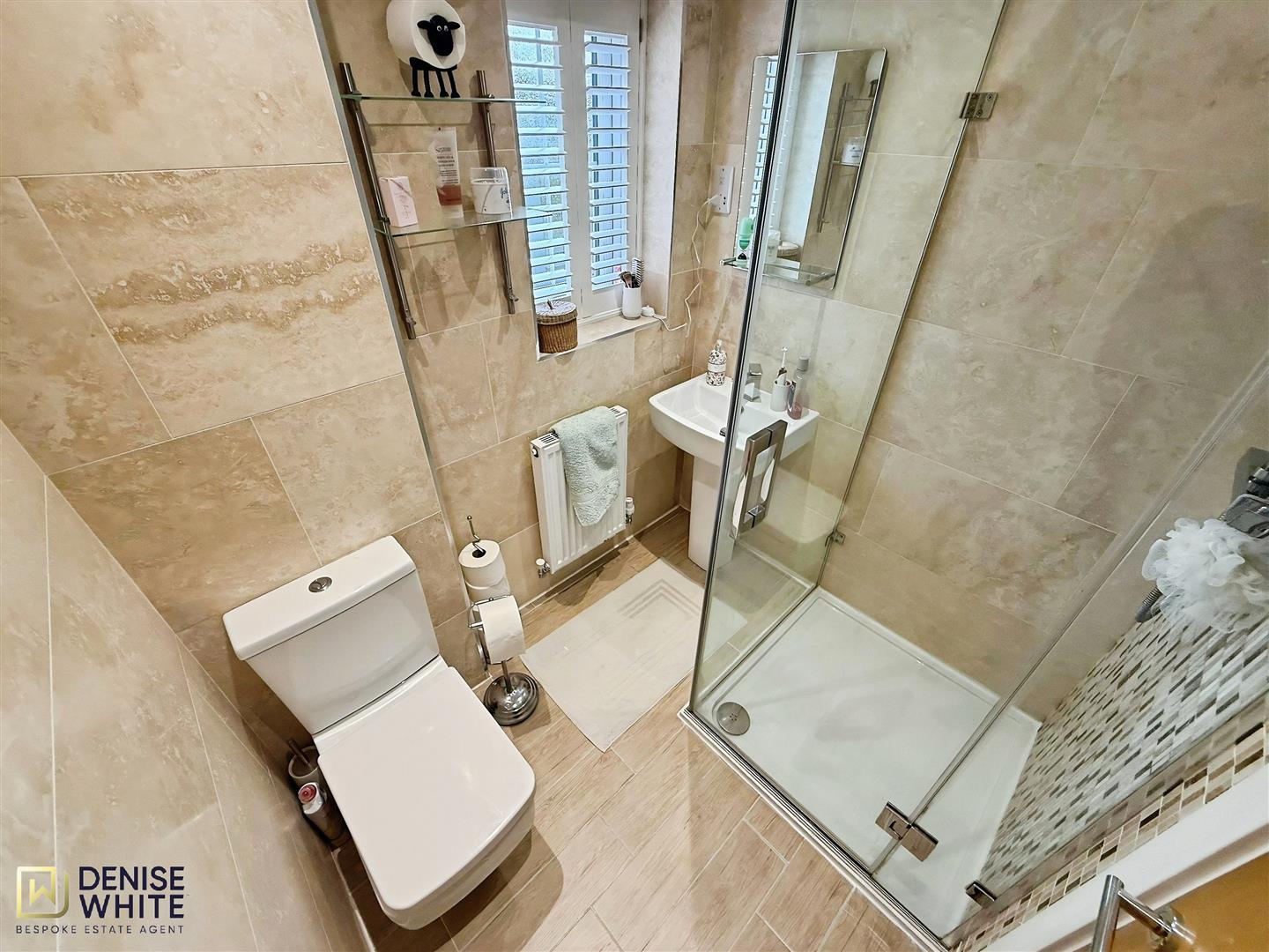 Wooden design flooring. Wall mounted radiator. WC. Pedestal style wash handbasin. Shower cubicle with rain style shower. Obscured UPVC double glazed window. Inset spotlights.