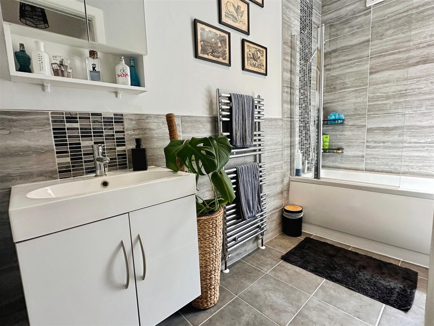 Fitted with a suite comprising of panelled bath with shower over, low-level WC and wall mounted vanity wash hand basin unit. Tiled flooring. Part tiled walls. Obscured uPVC window to the rear aspect. Wall mounted heated towel rail. Ceiling spotlights. Loft access.