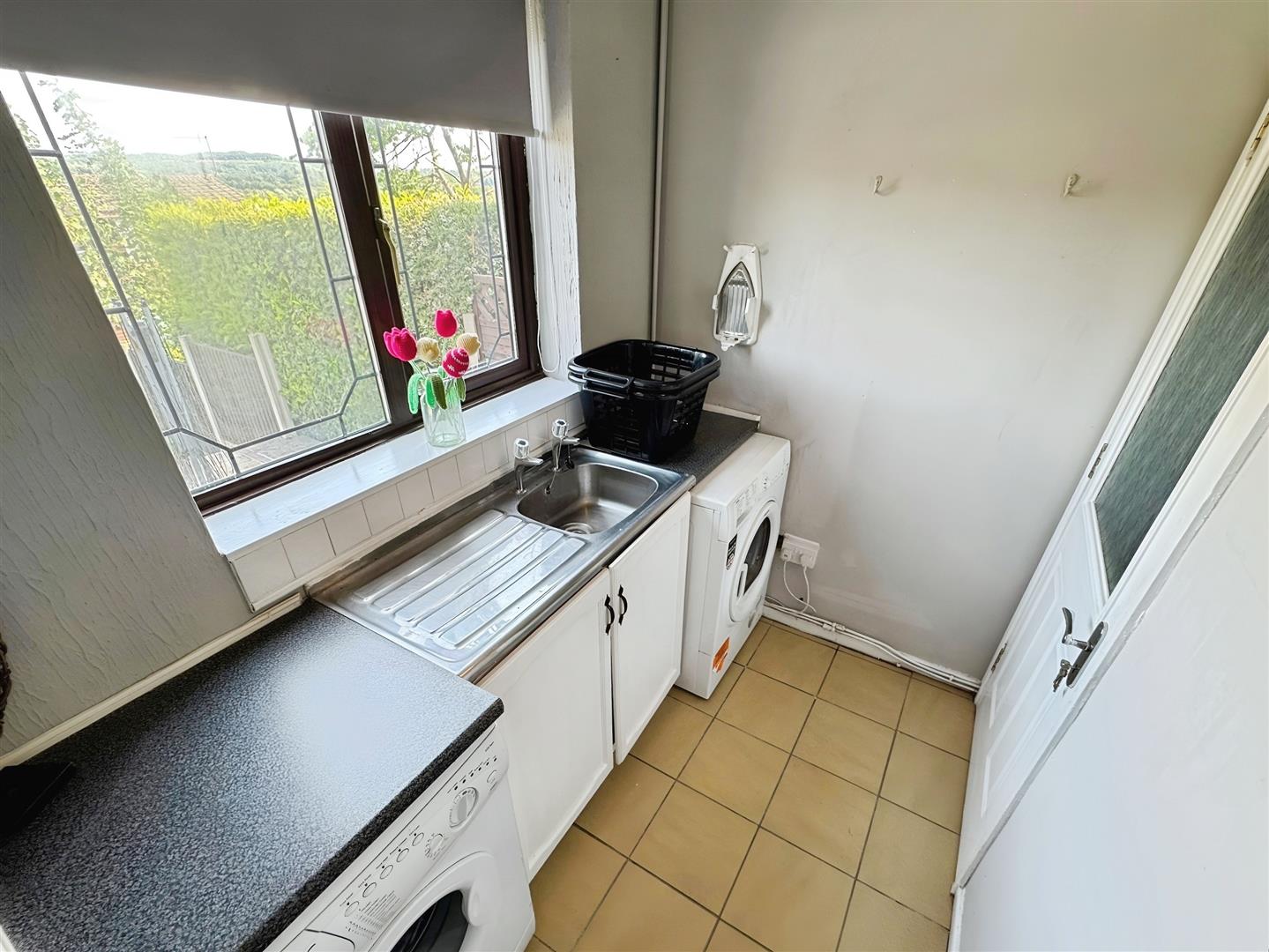 Fitted with a stainless steel sink and drainer unit. Space for tumble dryer. Plumbing for automatic washing machine. Tiled flooring. uPVC window to the rear aspect. Ceiling light.