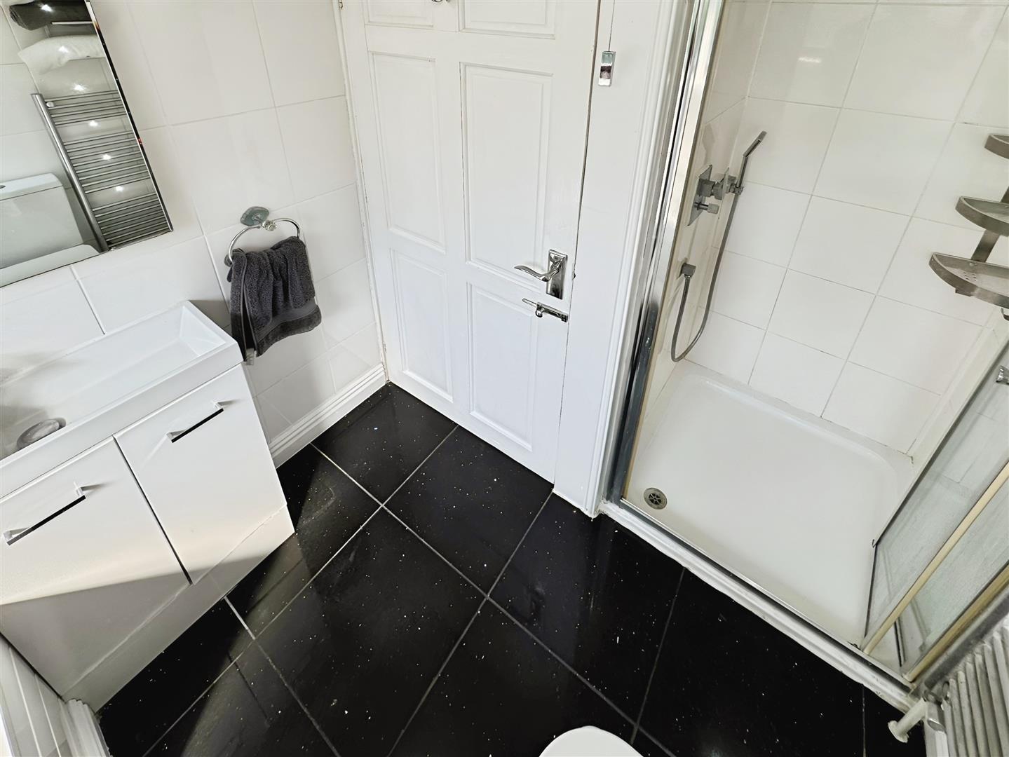 Fitted with a modern white suite comprising of panelled bath with mixer tap, low-level WC, vanity wash hand basin unit and shower cubicle. Tiled flooring. Fully tiled walls. Wall mounted heated towel rail. Ceiling Spotlights. Obscured uPVC window to the front aspect.