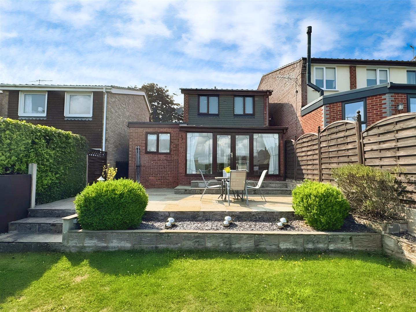 To the rear of the property there is a delightful private and enclosed garden. French doors lead from the conservatory out on to a paved patio seating area, from which steps lead to a good sized lawn. From the patio there are some lovely views out over the surrounding area and countryside beyond.