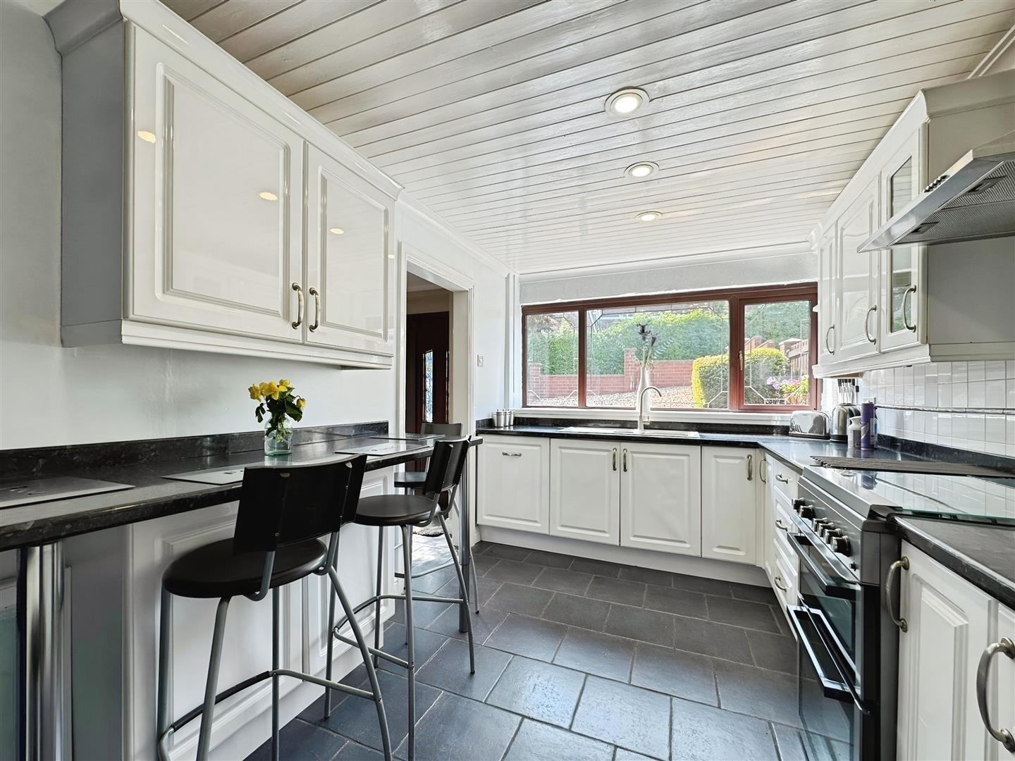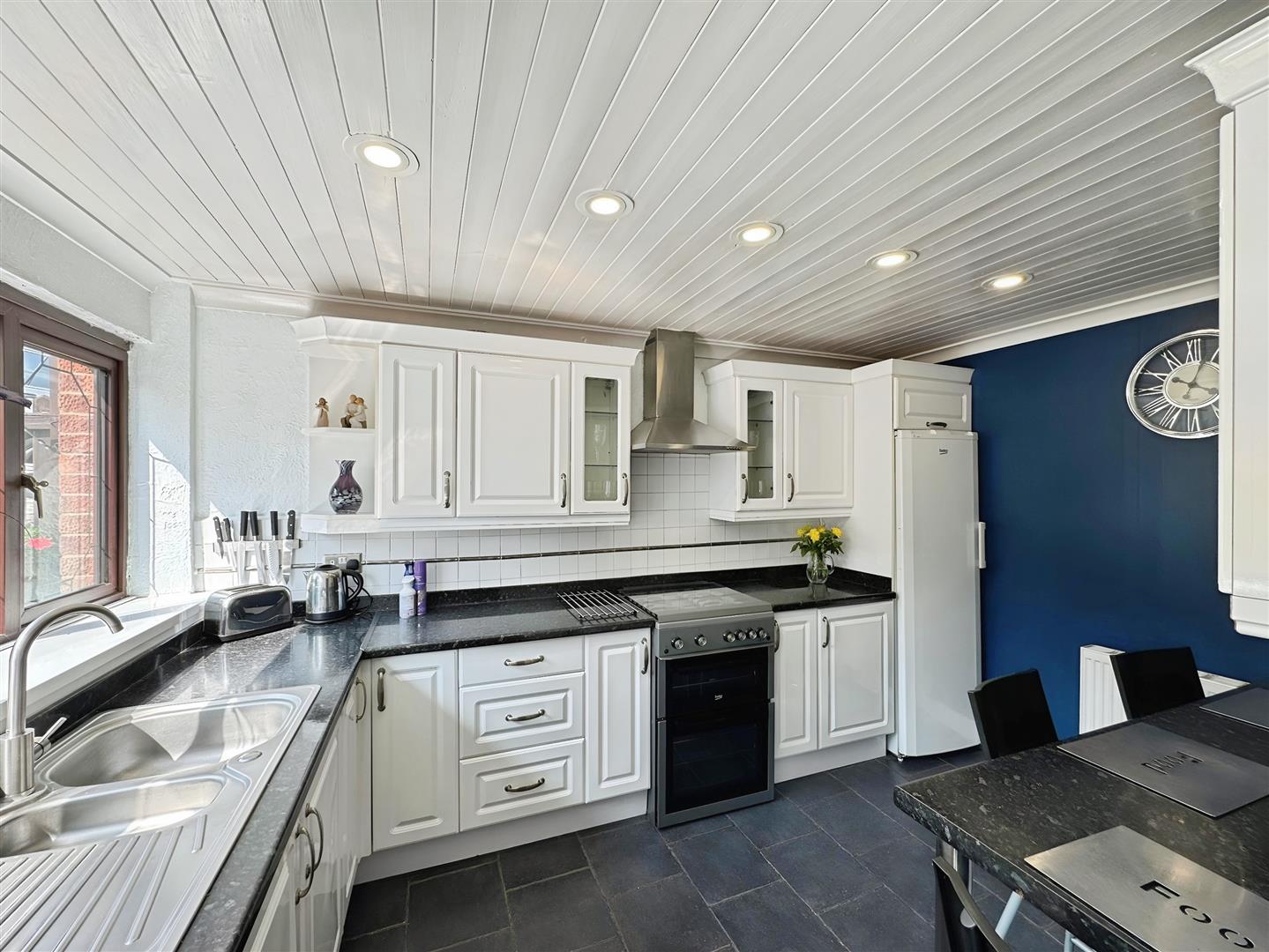 Fitted with a range of wall and base units with worksurfaces over incorporating one and a half bowl sink and drainer unit with mixer tap. Integrated dishwasher. Space for gas cooker. Space for fridge freezer. Tile splashback. Tiled flooring. Radiator. Ceiling spotlights. uPVC window to the front aspect.