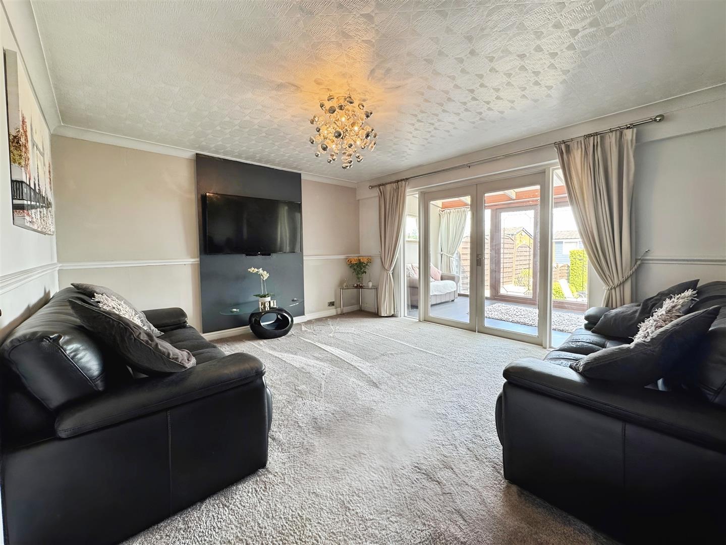 Laminate flooring. Radiator. Two wall lights. uPVC French doors leading to the rear garden.