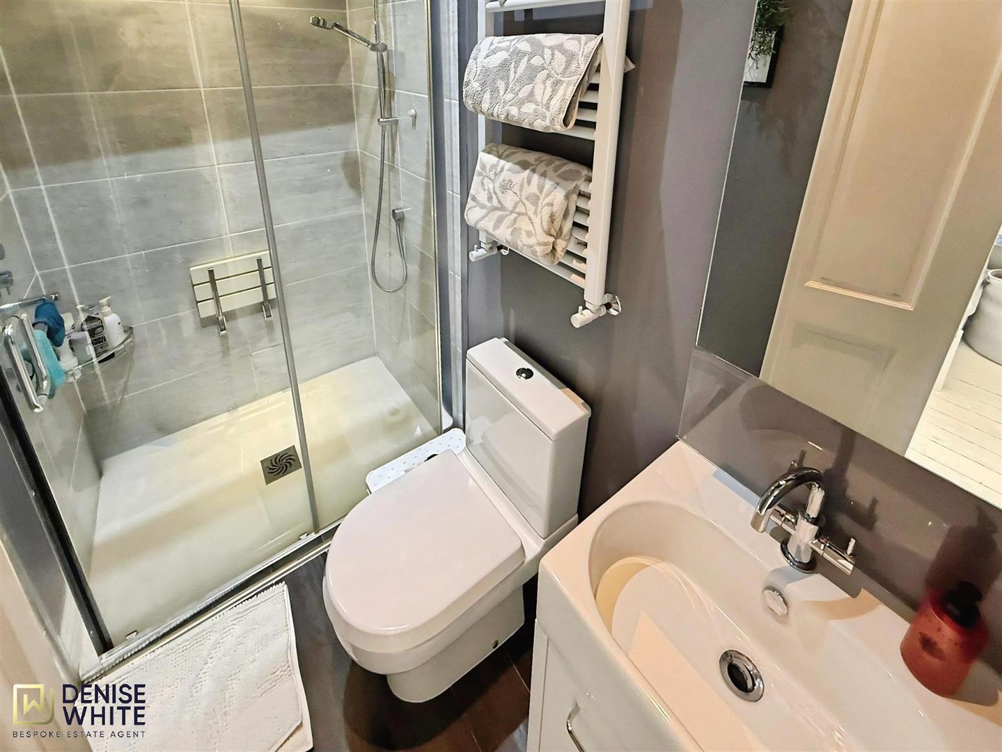 Fitted with a suite comprising of fully tiled shower cubicle, low level WC and pedestal wash hand basin. Wooden effect flooring.