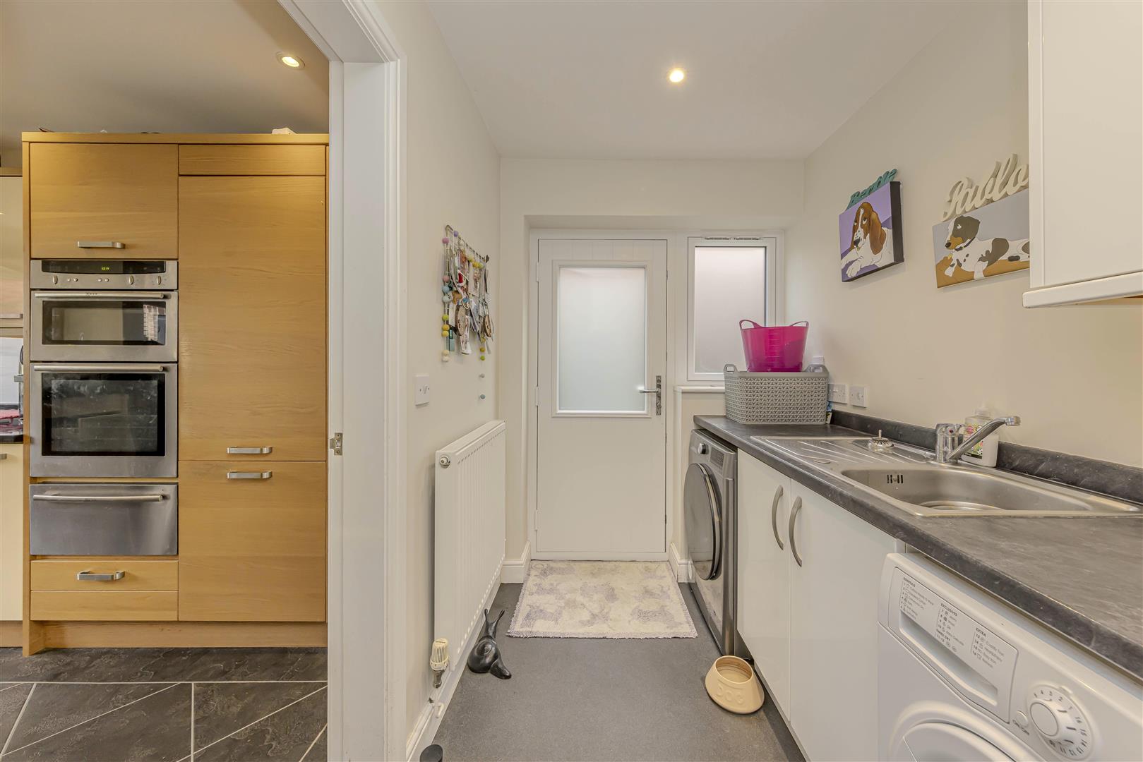 Fitted with wall and base units with worksurface over incorporating stainless steel sink and draining unit with mixer tap. Vinyl flooring. Plumbing for automatic washing machine. Space and outlet for a tumble dryer. Radiator. Composite door to the side aspect. Obscured uPVC window to the side aspect. Ceiling spotlights.