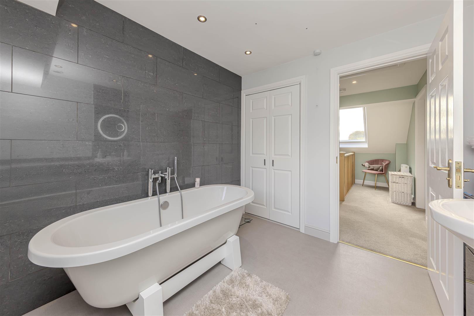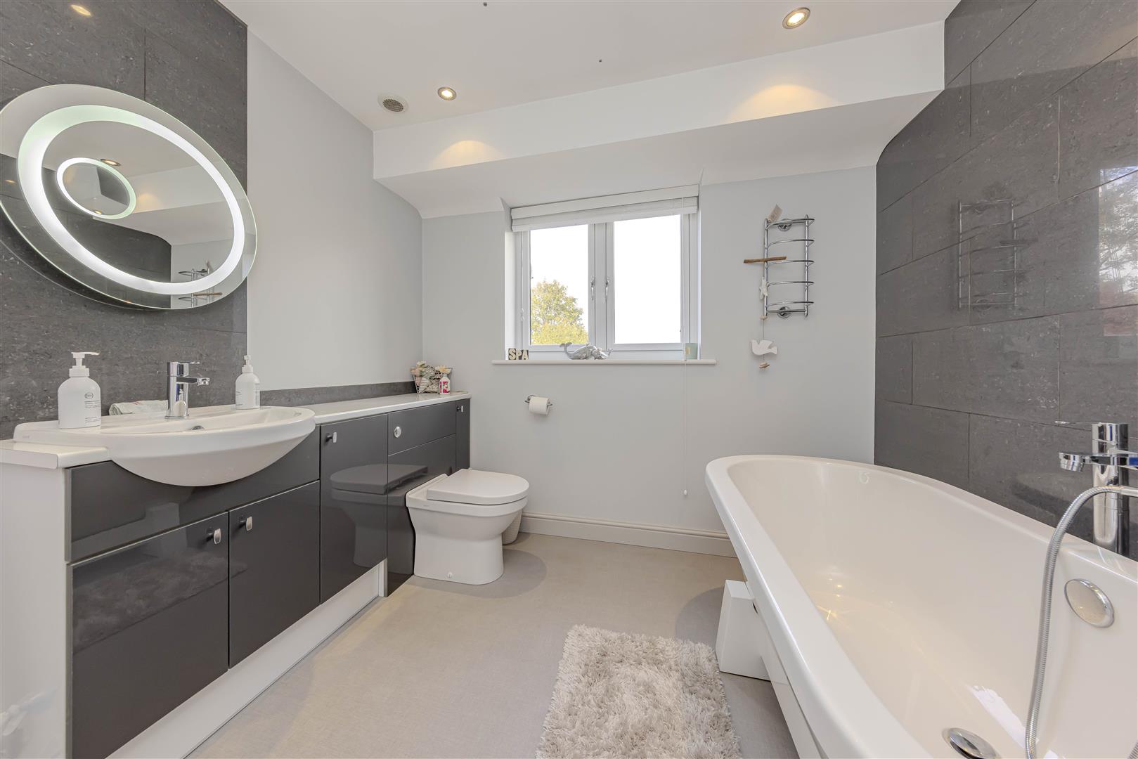 Fitted with a suite comprising of freestanding double ended bath with freestanding shower mixer tap and vanity unit housing a low-level WC and wash hand basin. Vinyl flooring. Part tiled walls. Wall mounted heated towel rail. Airing cupboard off. Ceiling spotlights.