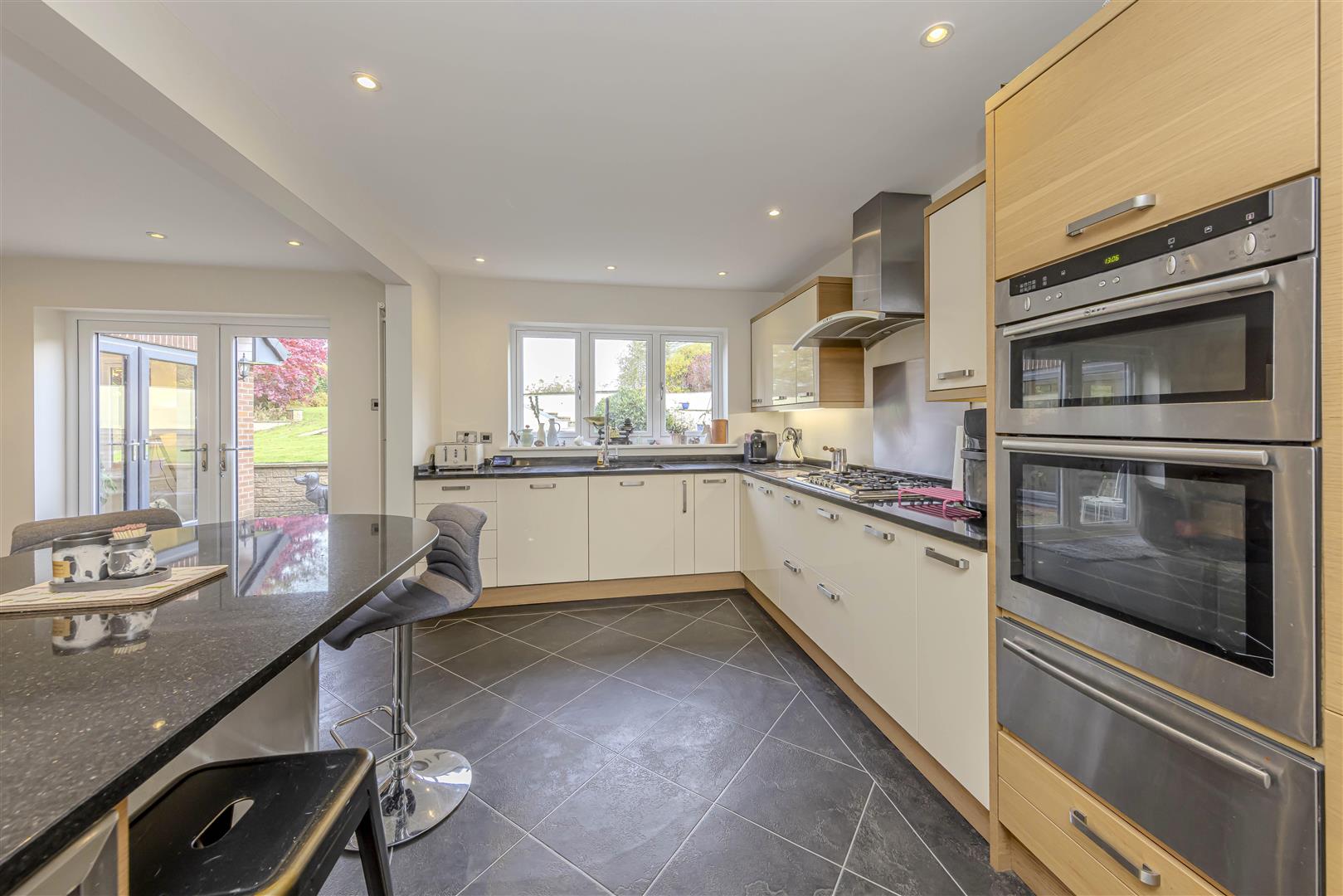 Fitted with a range of wall and base units with granite work surfaces over incorporating an inset 'Franke' one and a half bowl stainless steel sink and drainer unit with hose mixer tap and built in waste disposal. Integrated gas hob with extractor over, double electric oven, warming drawer, dishwasher, Wine fridge, and fridge freezer. uPVC French doors leading to the garden. uPVC window to the rear aspect. Karndean flooring. Two radiators. Wall mounted upright radiator. French doors leading to the dining room. Door leading to the utility room. Ceiling spotlights.