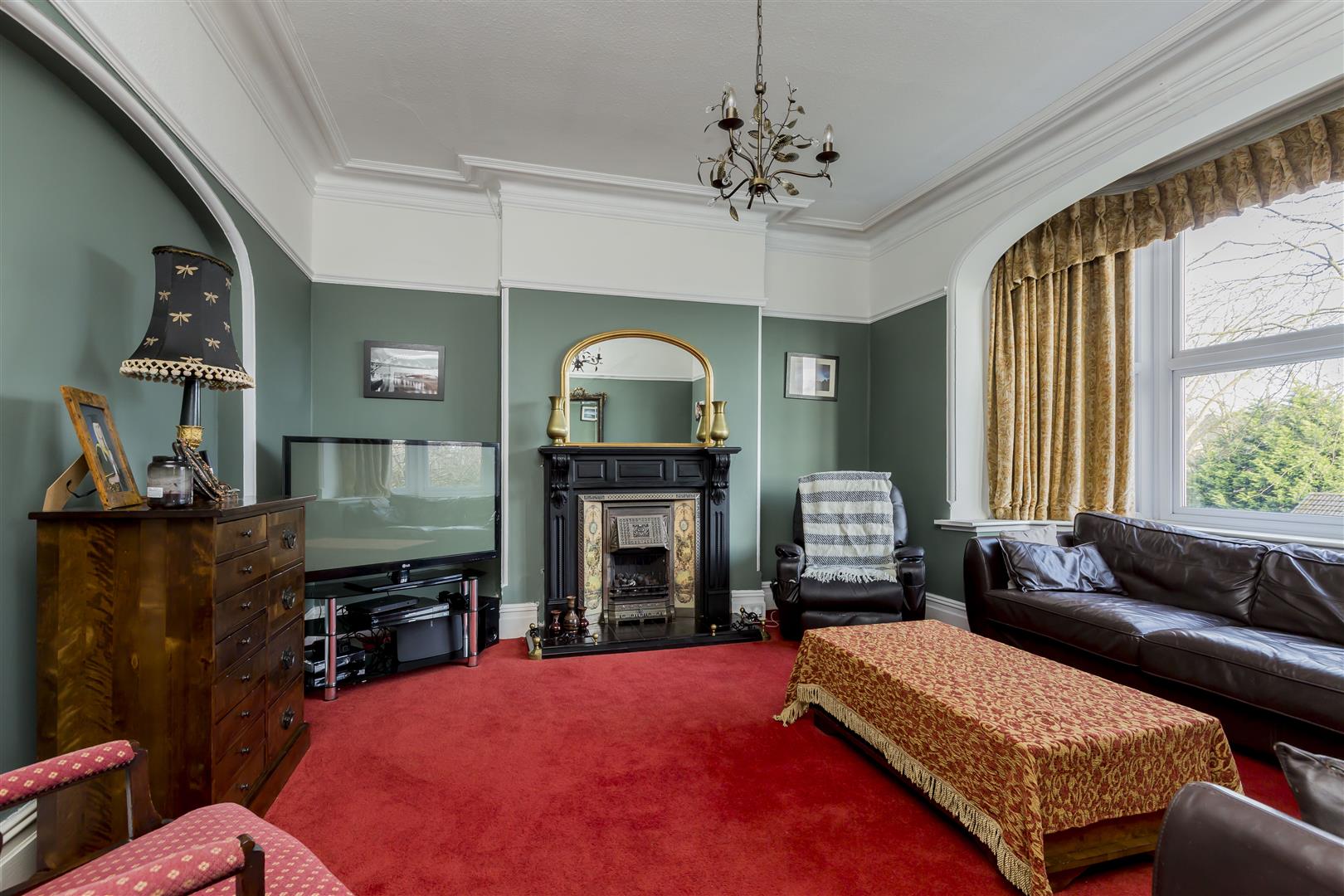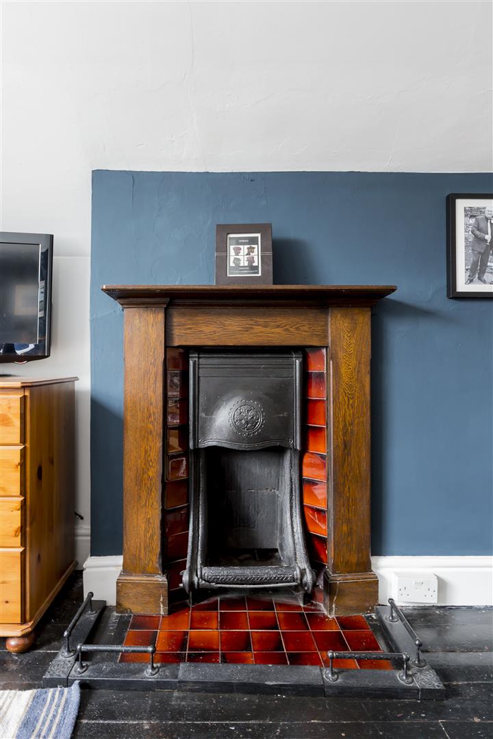 uPVC bay window to front, beautiful period fireplace with tiled inset, living flame gas fire, cornice to the ceiling, carpet flooring, picture rail, television point, radiator, alcove.