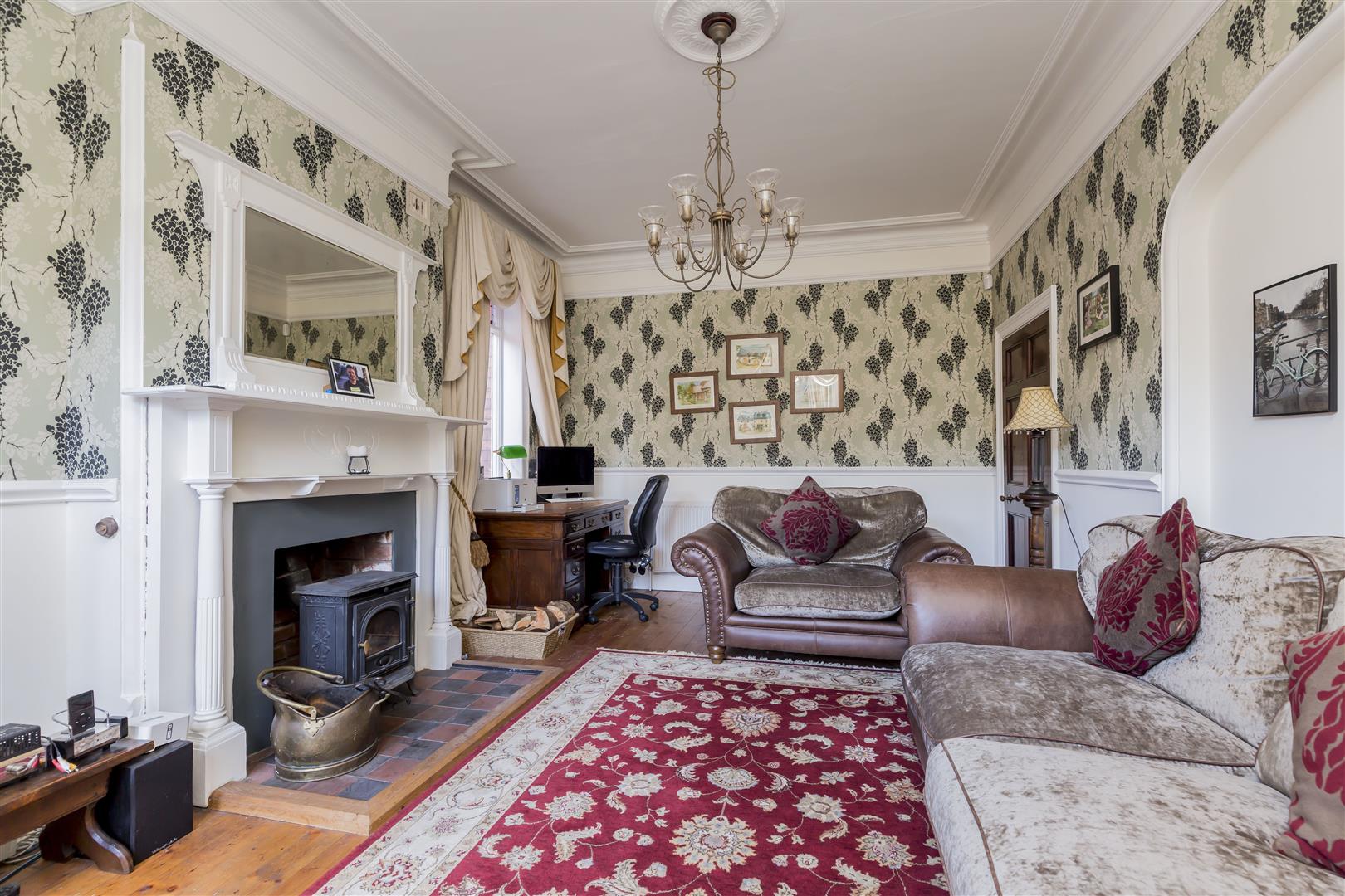 Original wood flooring, double doors leading out to rear the rear garden, full length windows to the rear, window to the side with stained glass panel, multi fuel burner set in a period fireplace with mirror over and tiled hearth, picture rail, cornice to ceiling, ceiling light, dado rail, radiator, alcove.