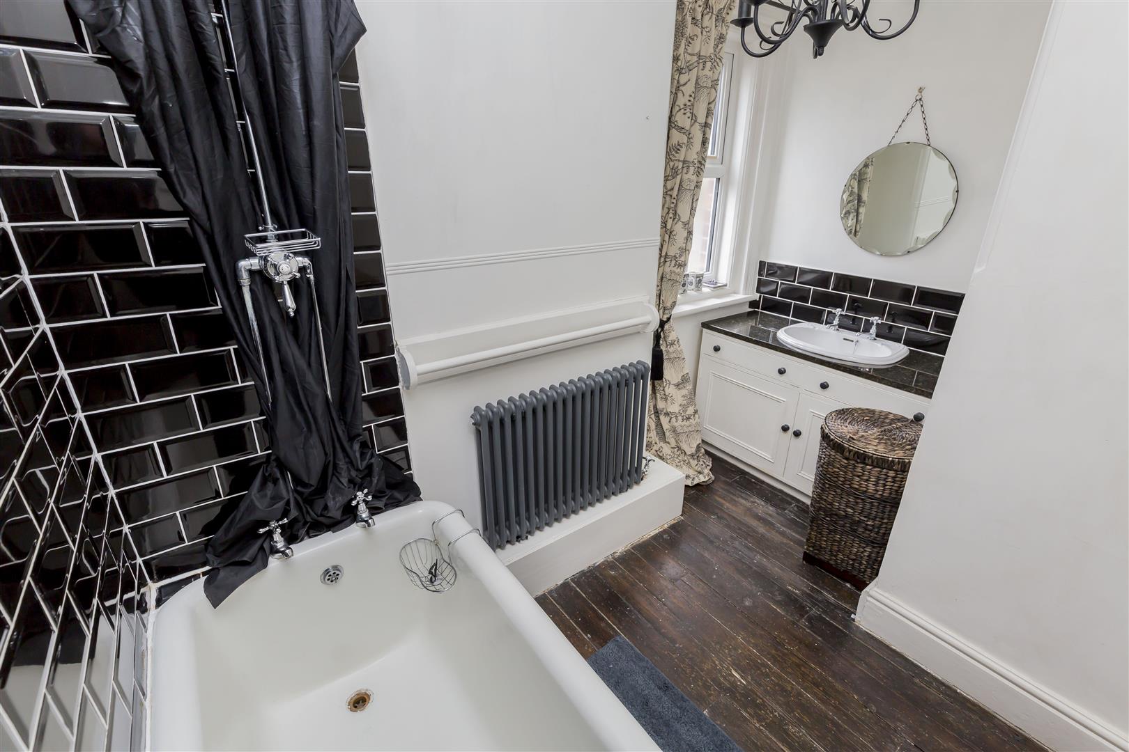 Wooden flooring, roll top bath with overhead shower with black and white tiled design tiling, vanity sink unit with storage space under and tiled splash backs, storage cupboards, ceiling light, wall mounted Victorian style radiator and uPVC window to rear.
