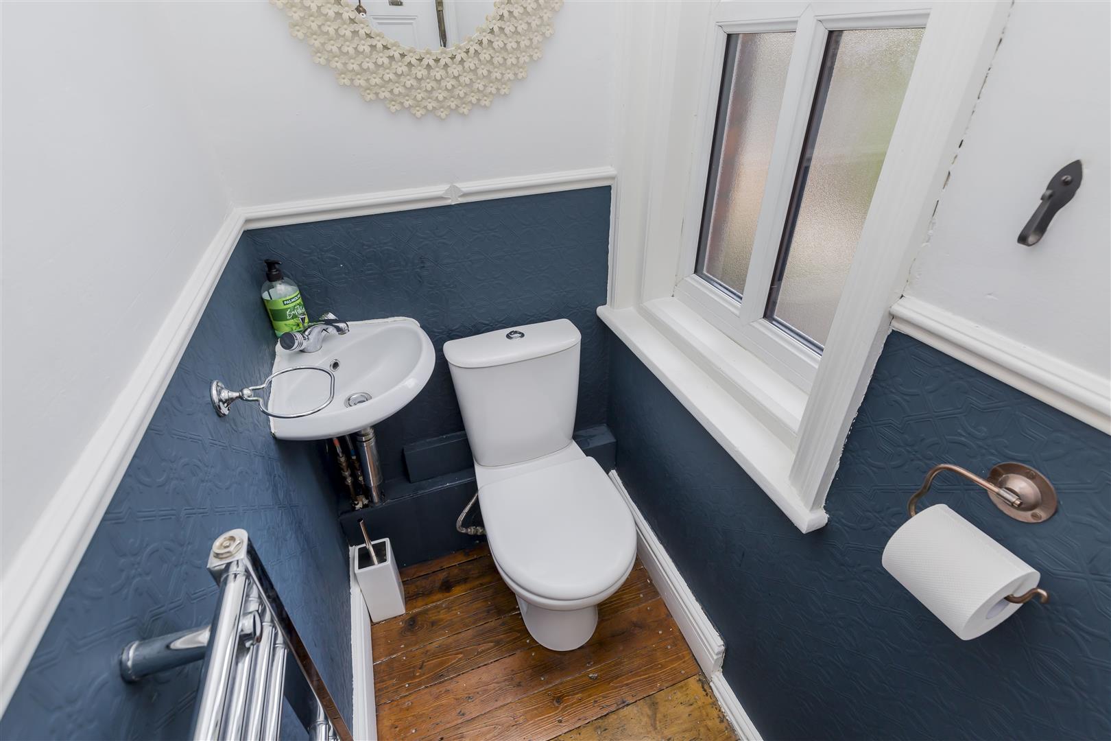 Wooden flooring, toilet, wash hand basin, uPVC window to side, dado rail and cornice to ceiling, ceiling light, heated towel rail.