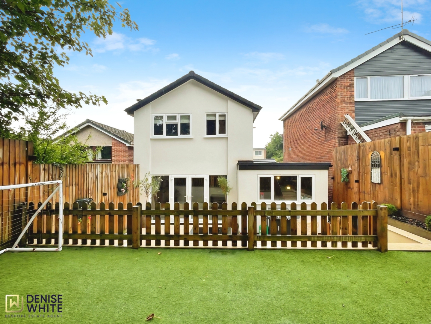 Externally, the home occupies a generous plot with a standout enclosed rear garden. Thoughtfully landscaped over two tiers, it includes a large tiled patio—ideal for outdoor dining and entertaining—and a raised astroturf area, perfect for children to play safely.
