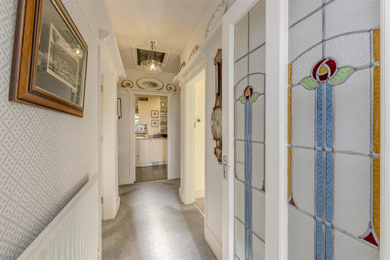 Upon entering, you are welcomed by a spacious entrance hall featuring a radiator and a ceiling light. The elegant stained glass panes in the main front door add character, while a picture rail enhances the overall aesthetic. Access is provided to an additional hallway leading into the lounge, bedroom and innerhallway.