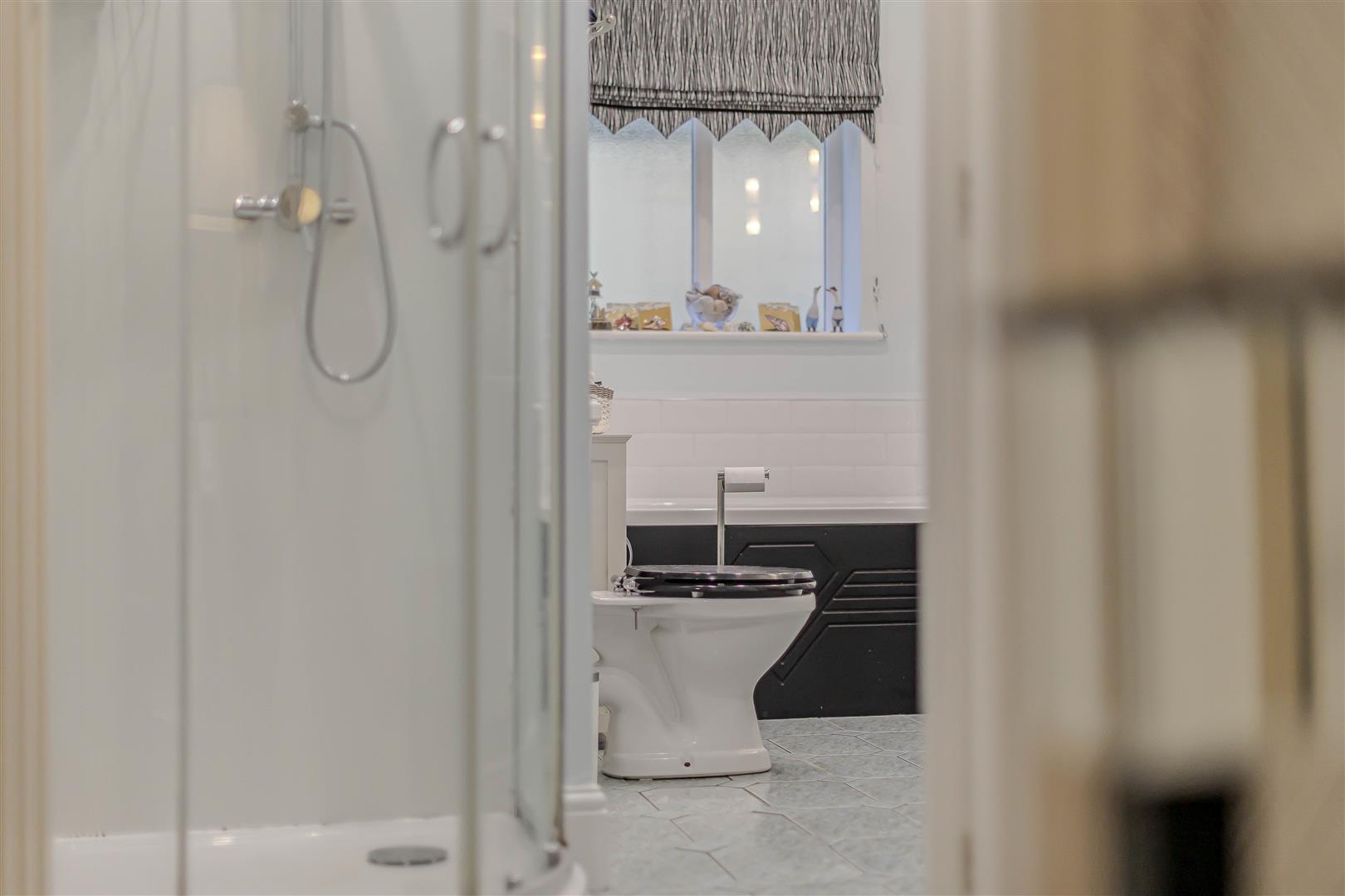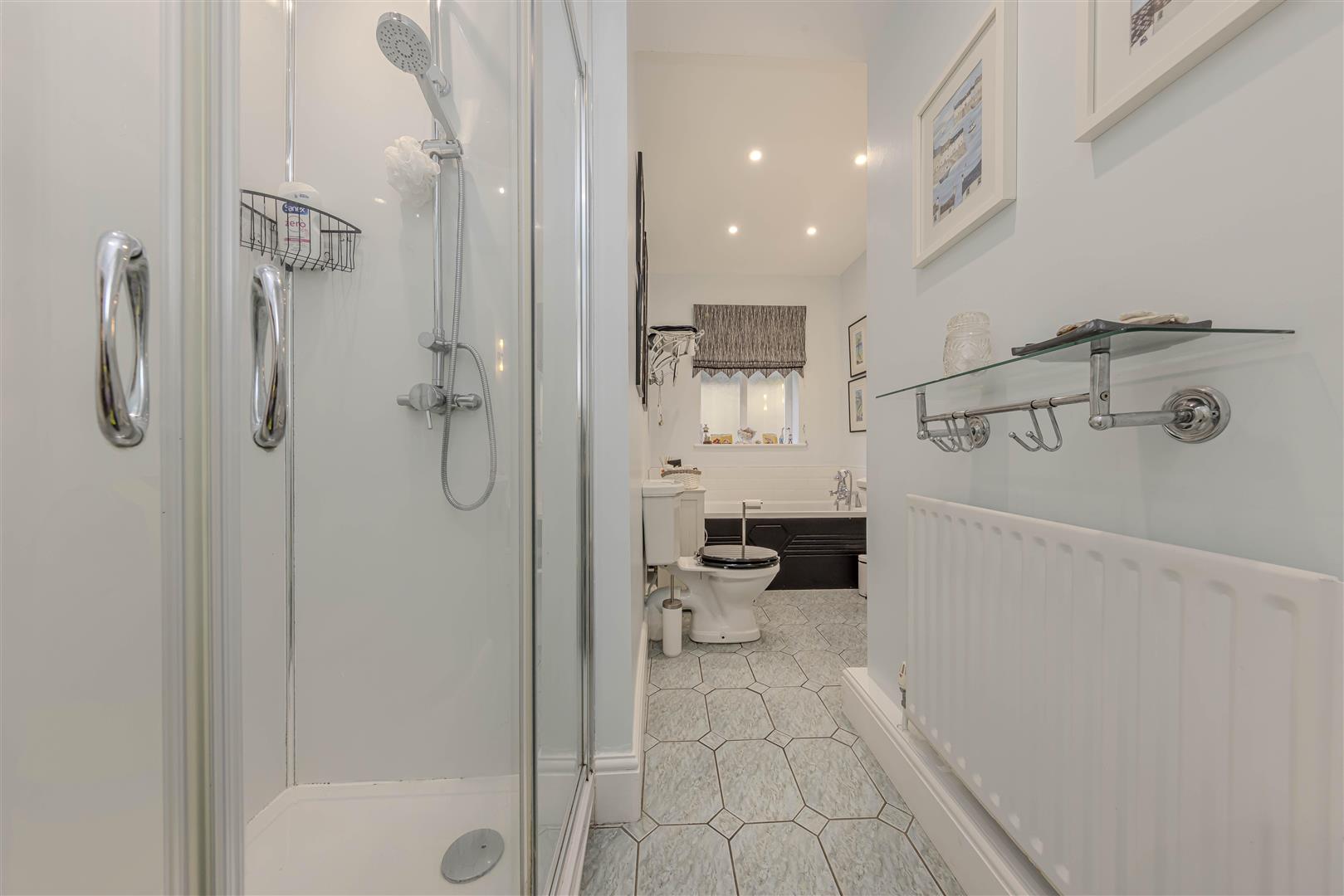 The family bathroom is fitted with a four-piece suite, comprising a bath with a shower attachment, a pedestal wash hand basin, a WC, and a shower cubicle equipped with a rain-style showerhead. Additional features include a radiator, towel rail, inset spotlighting, wall lights, and tiled splashback and flooring for easy maintenance.