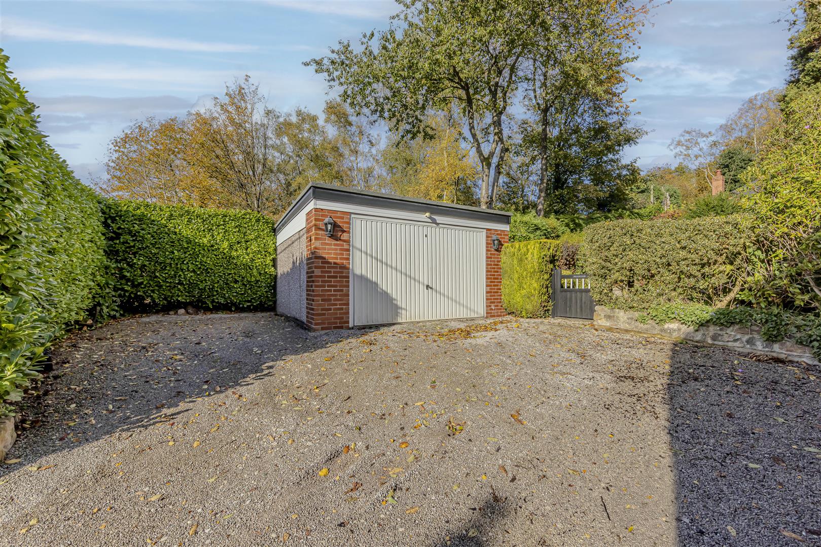 **Driveway & Garage:** The property is approached via a driveway that provides off-road parking and leads to a detached garage with an up-and-over door and outside lighting for safety and convenience.