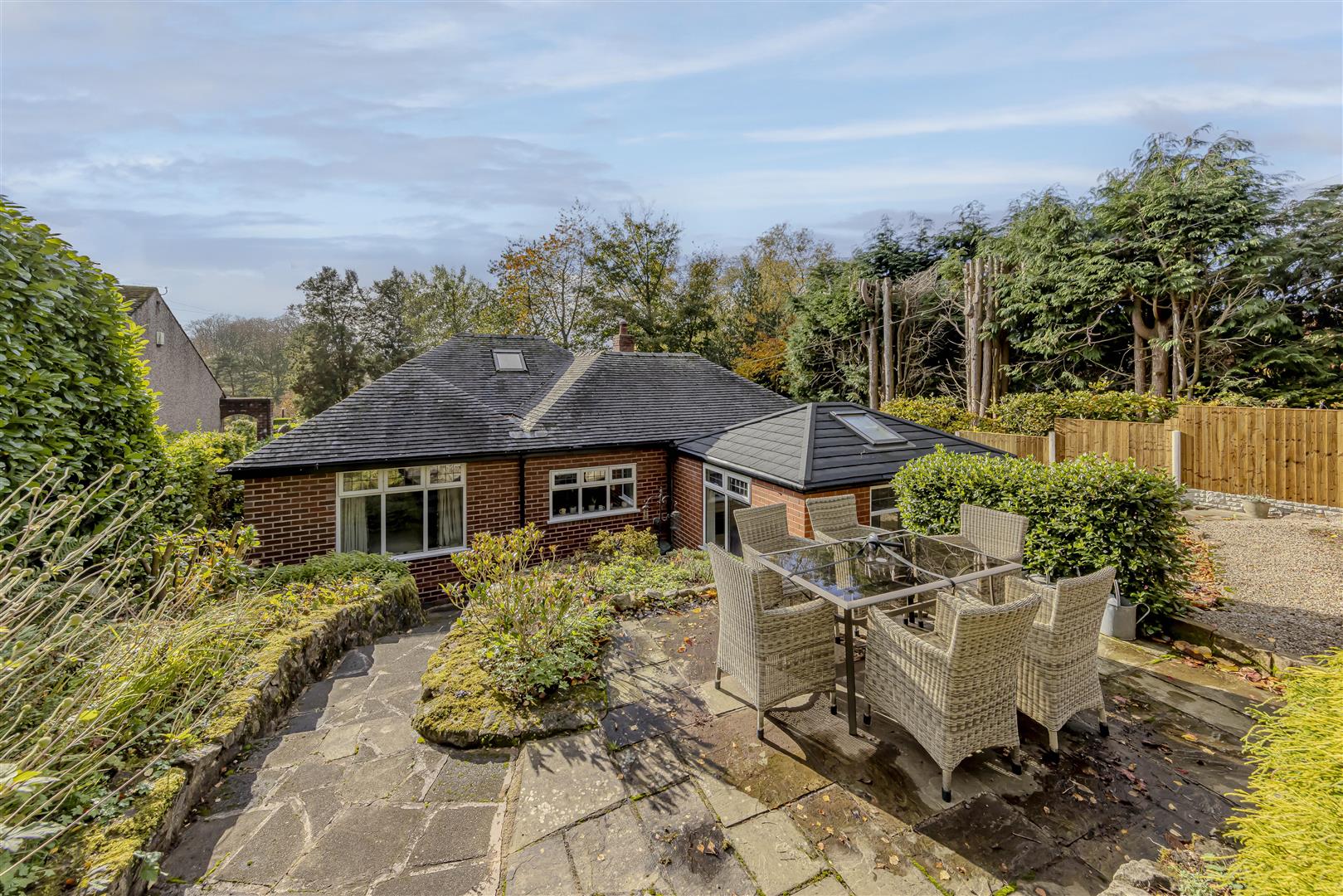- **Front Garden:** The front garden is an excellent size, featuring a lawn area with mature trees, hedging, and flower borders. Easy-access steps lead up to the main entrance, which includes a large flagged patio area with gated access on each side of the bungalow.