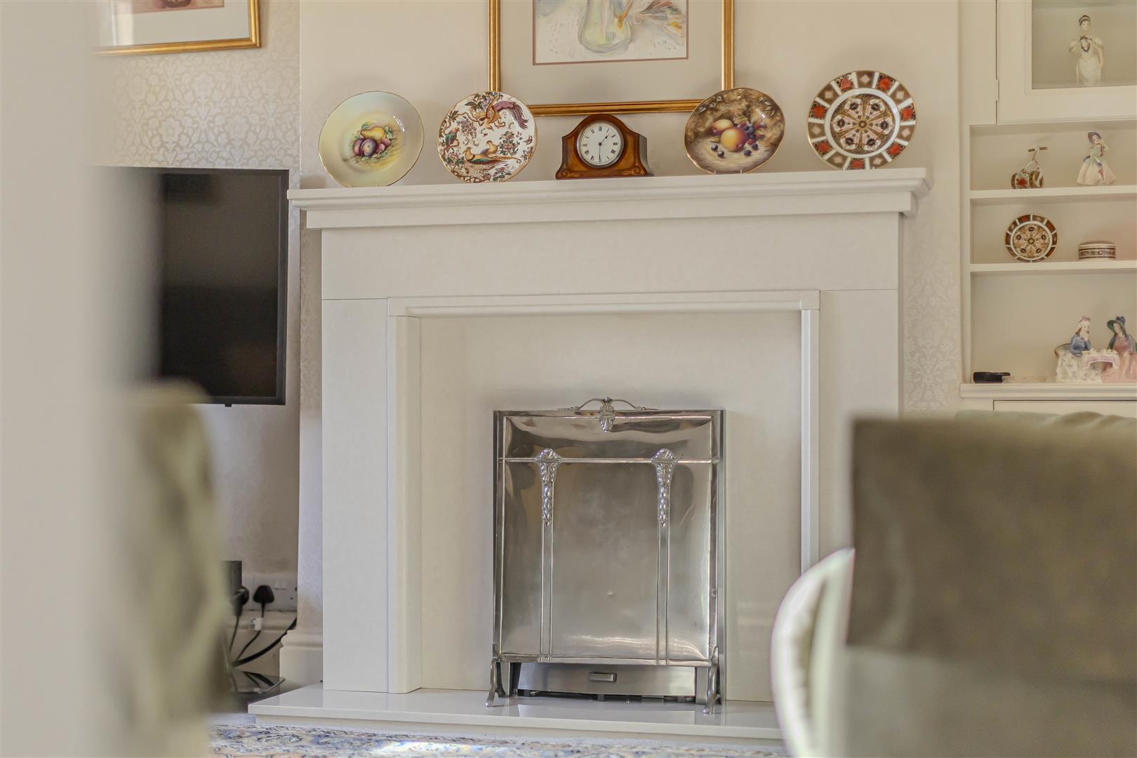 Located at the front of the property, the lounge is fitted with carpeting and a striking feature fireplace, complete with a window that overlooks the front aspect. Additional highlights include a radiator, picture rail, coving to the ceiling, and a ceiling light. The fitted display cabinet, with shelving both above and below, offers extra storage, enhancing the room's functionality.