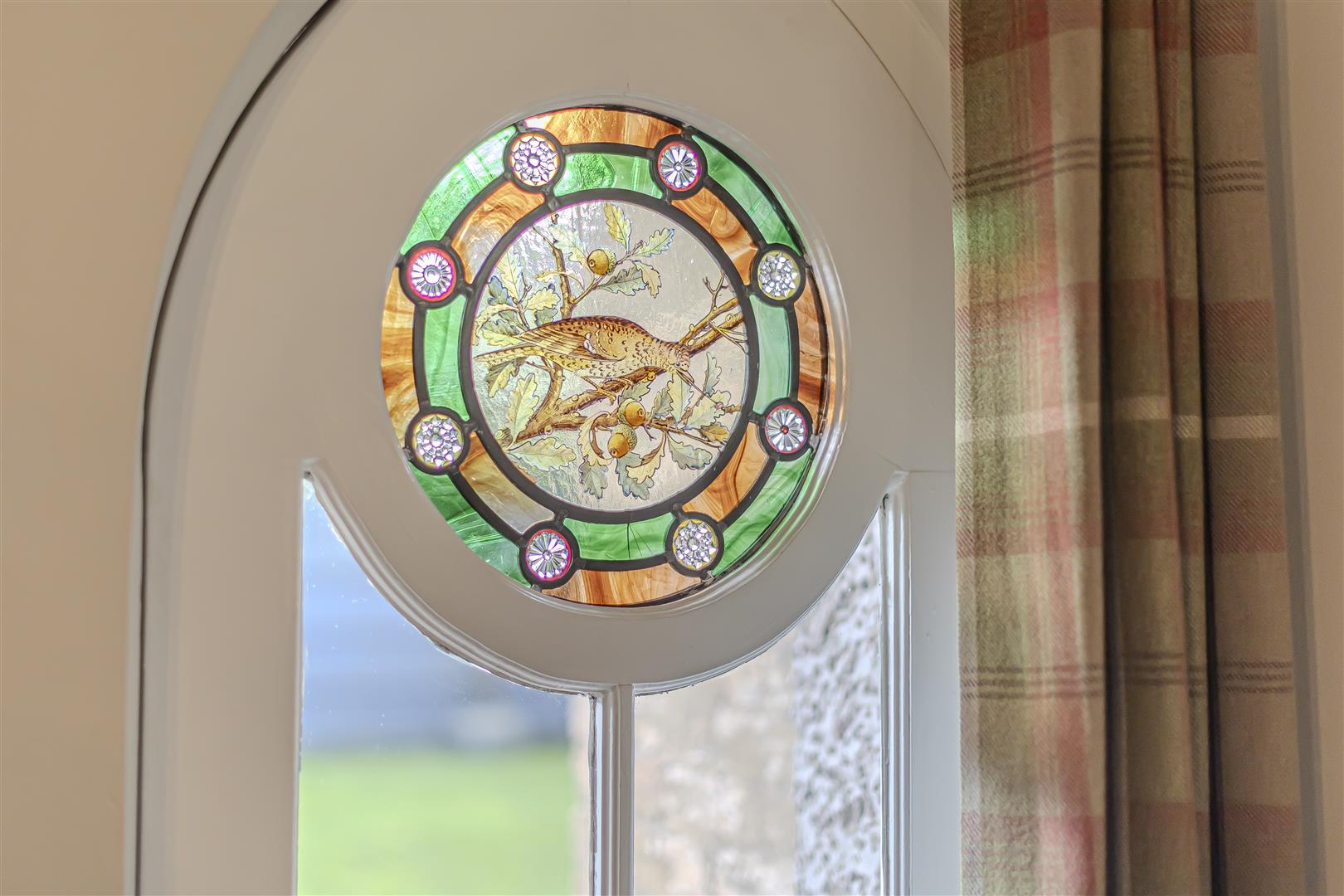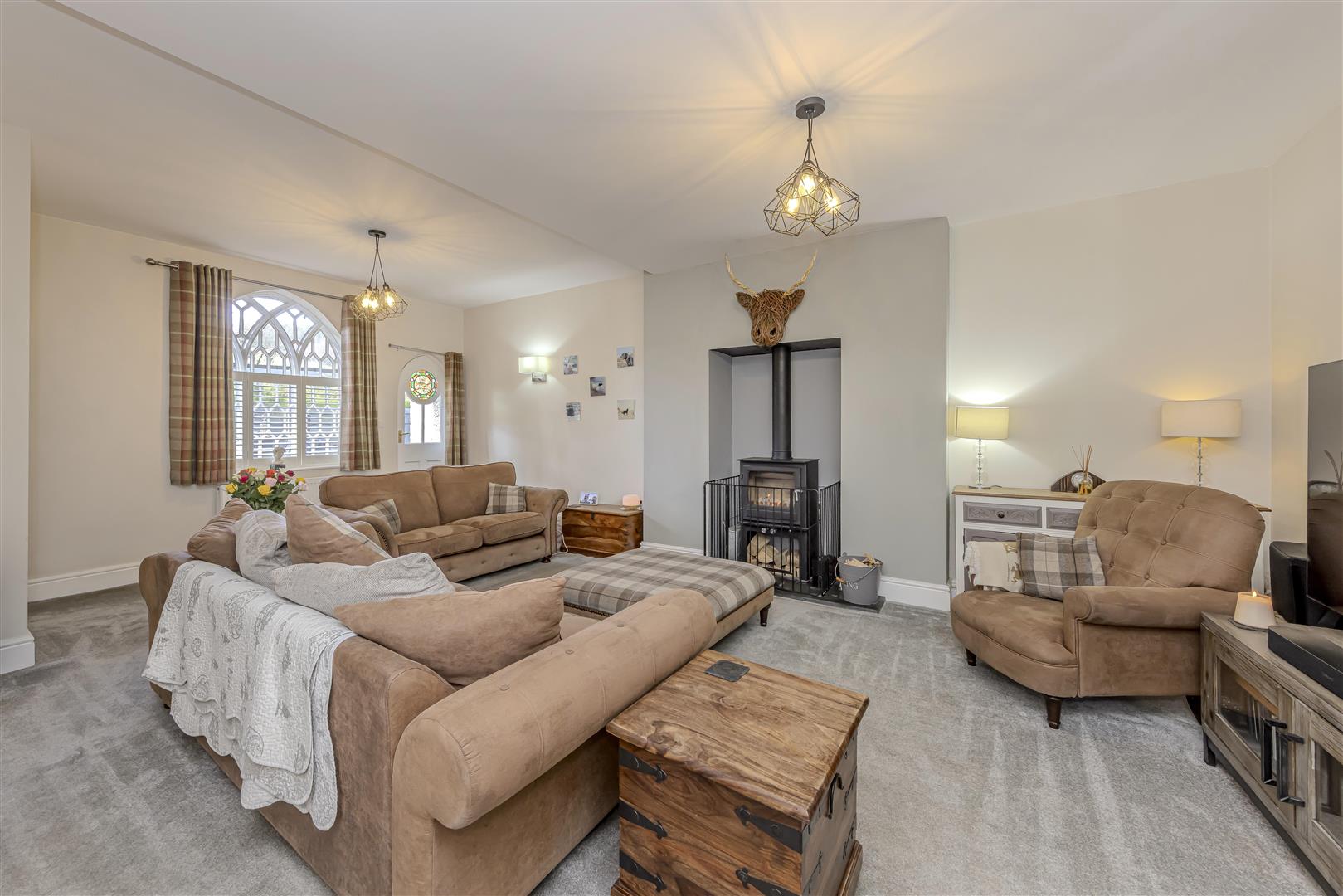 Carpet. Two radiators. Multi fuel stove set on a slate hearth. Two wall lights. Two ceiling lights. Original arched window to the rear aspect with built-in shutters. Original wooden door with stained glass window to the rear aspect. Door leading into: –