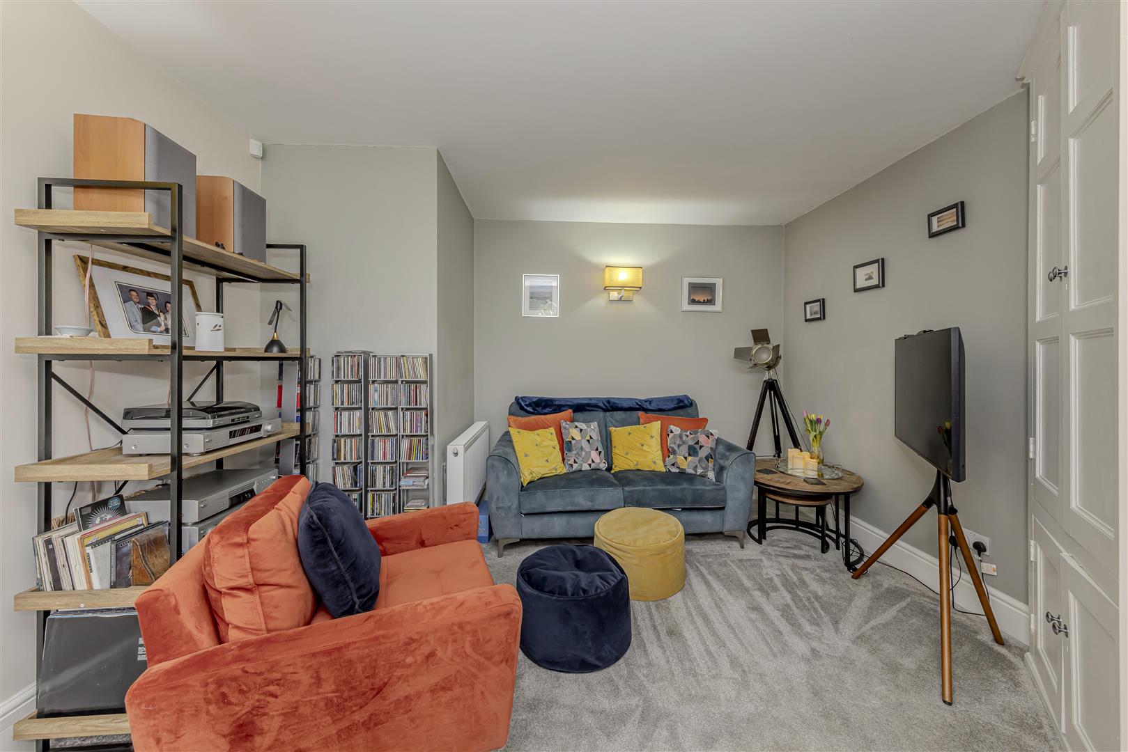 Carpet. Two radiators. Open fire with a ceramic tiled hearth and wooden surround. Three wall lights. Original arched window to the rear aspect with built-in shutters. Original built-in storage cupboards.