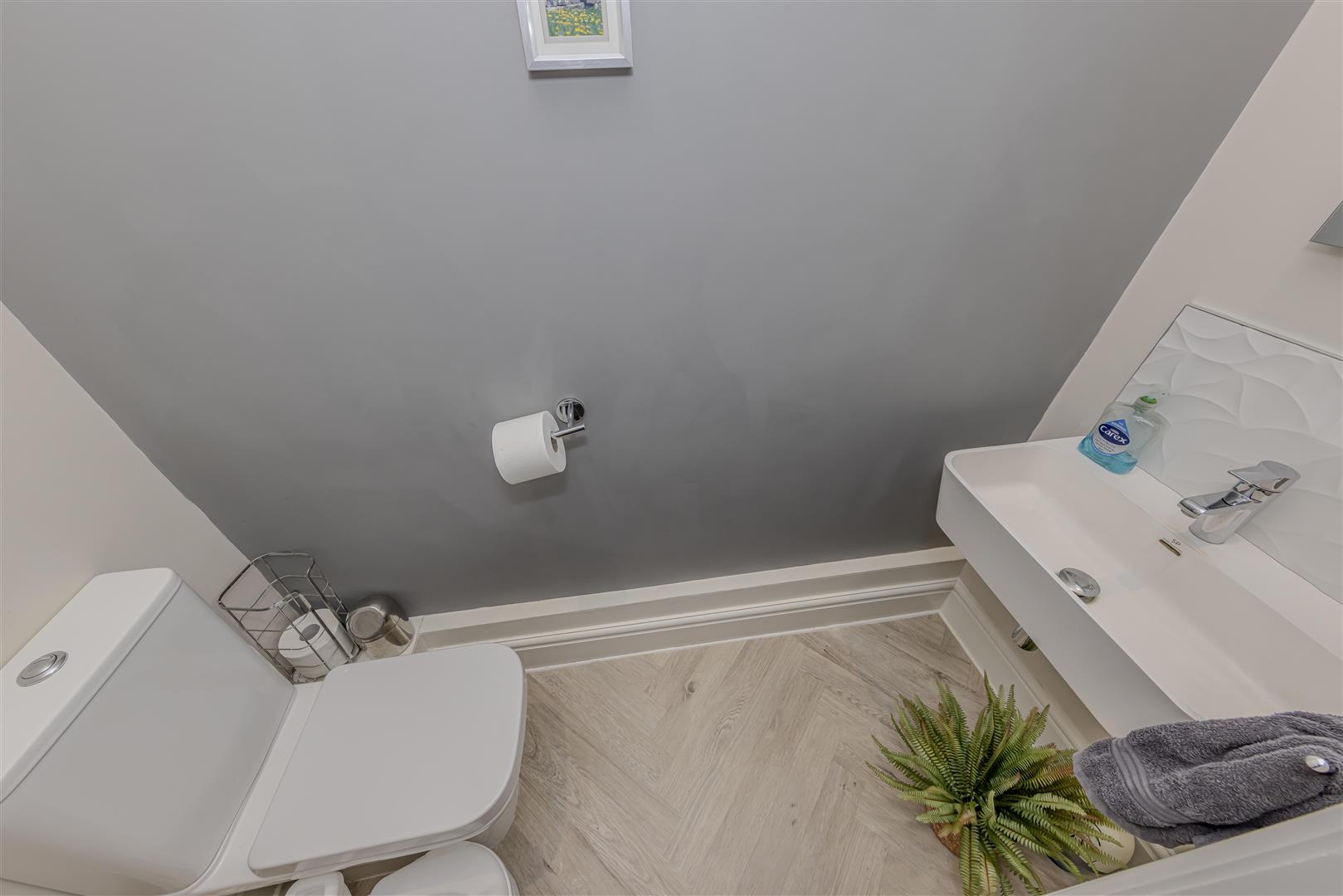 Fitted with a low-level WC and wall mounted wash hand basin. Herringbone style vinyl flooring. Ceiling light.