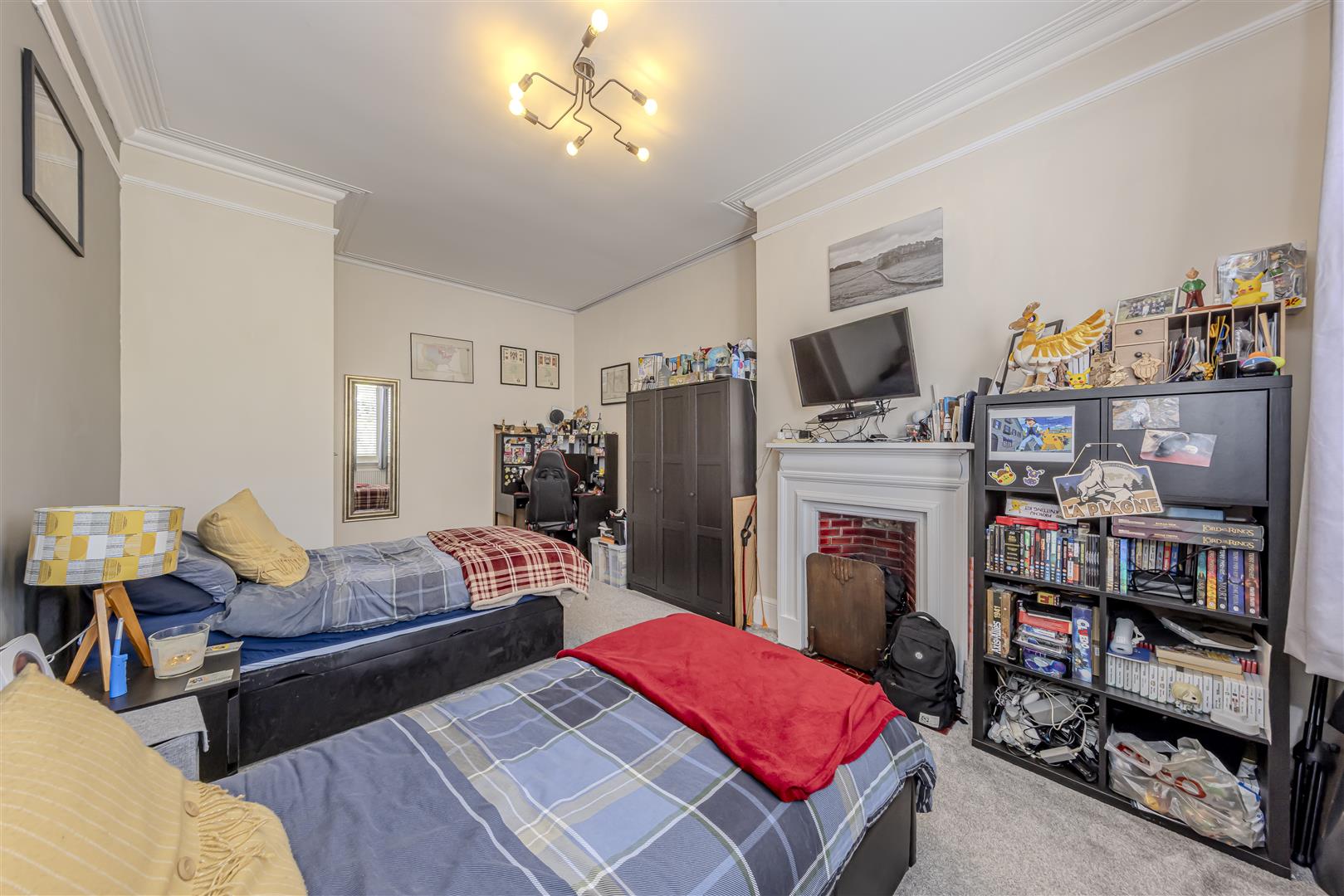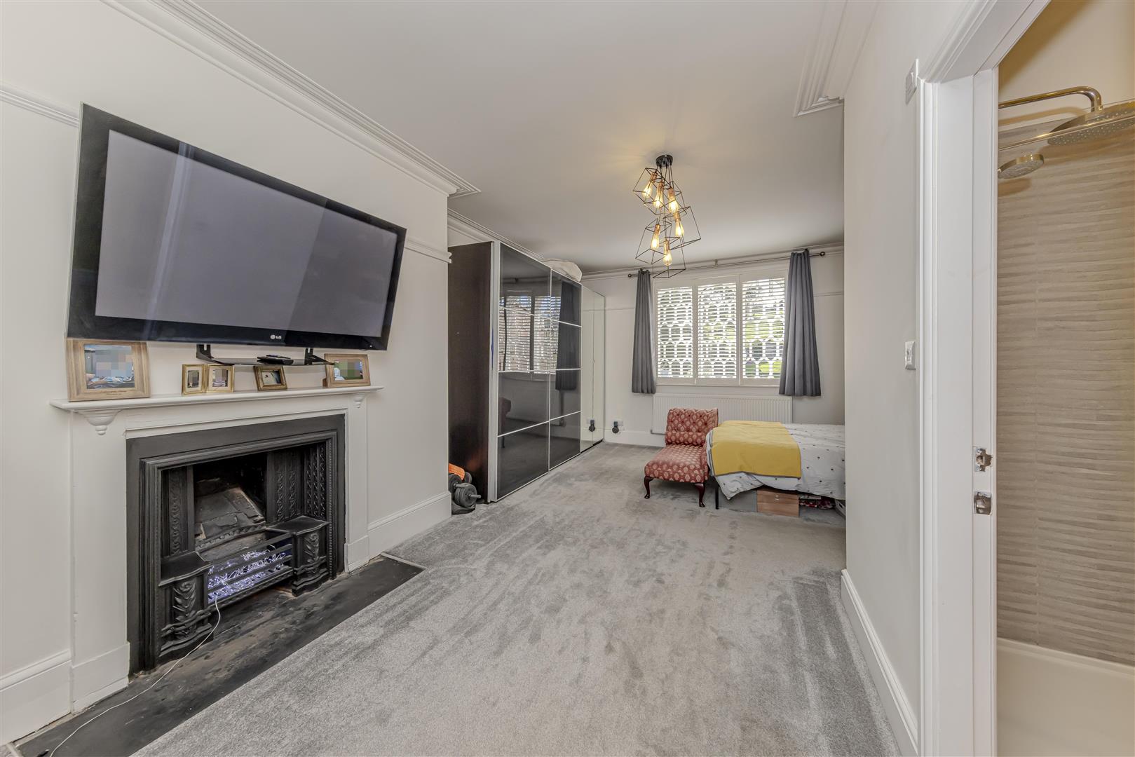 Carpet. Radiator. Original feature fireplace. Original arch windows to the rear aspect with built-in shutters. Picture rail. Coving to the ceiling. Ceiling light.