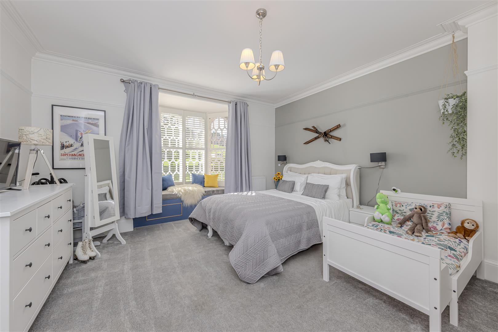 Carpet. Two radiators. Original bay window to the rear aspect with built-in shutters. Picture rail. Coving to the ceiling. Ceiling light.