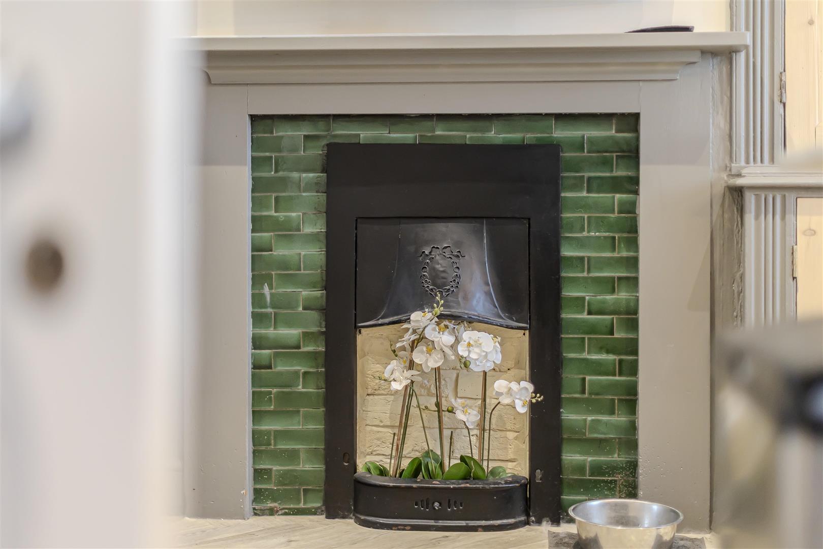 Fitted with an extensive range of wall and base units with quartz work surfaces over incorporating a four ring induction hob and a 'Blanco' stainless steel sink unit with boiling mixer tap. Integrated double electric oven, coffee machine, dishwasher and fridge freezer. Herringbone style vinyl flooring. Feature fireplace. Radiator. Original window to the rear aspect fitted with shutters. Ceiling light and spotlights.