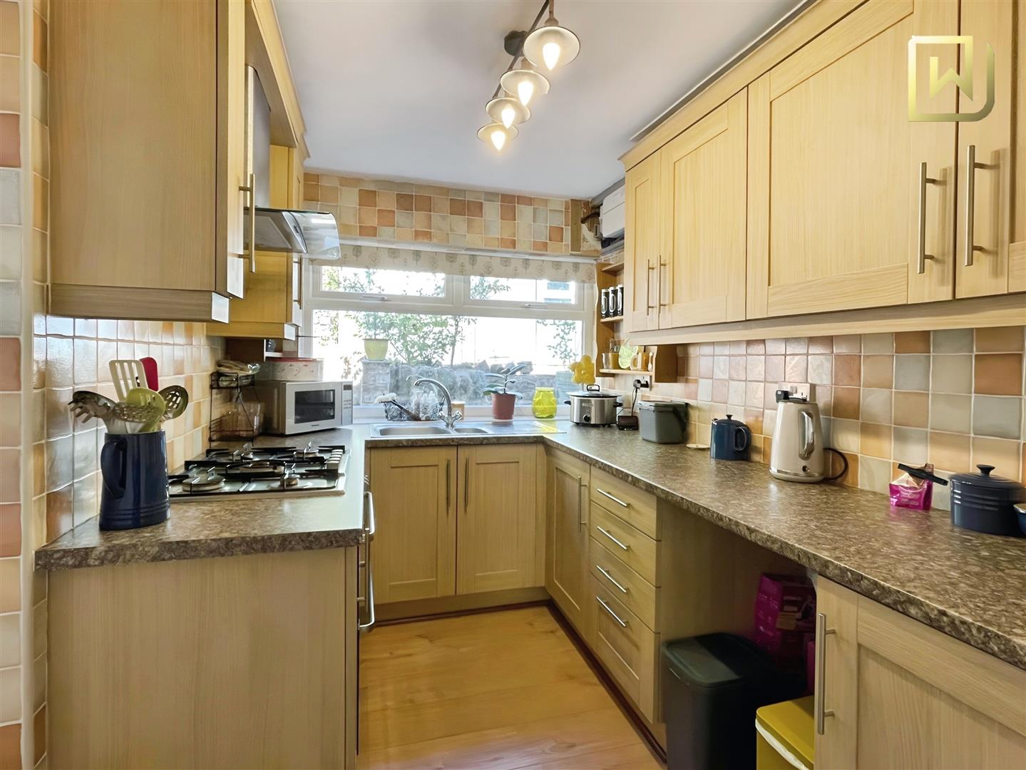 Continued wood effect flooring. A range of shaker, style wall and base units with laminate work surfaces above. Integrated stainless steel sink and drainer unit with mixer tap above. UPVC double glazed window to the rear aspect. Gas cooker and hob with extractor fan above. Ceiling light.