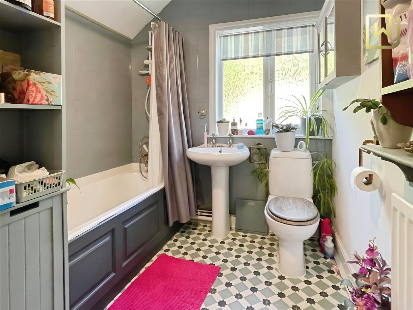Vinyl flooring. Fitted bath with electric shower above. Pedestal wash handbasin. Low-level WC. Wall mounted radiator. Obscured UPVC double glazed window to the rear aspect. Storage cupboard, housing boiler. Ceiling light.