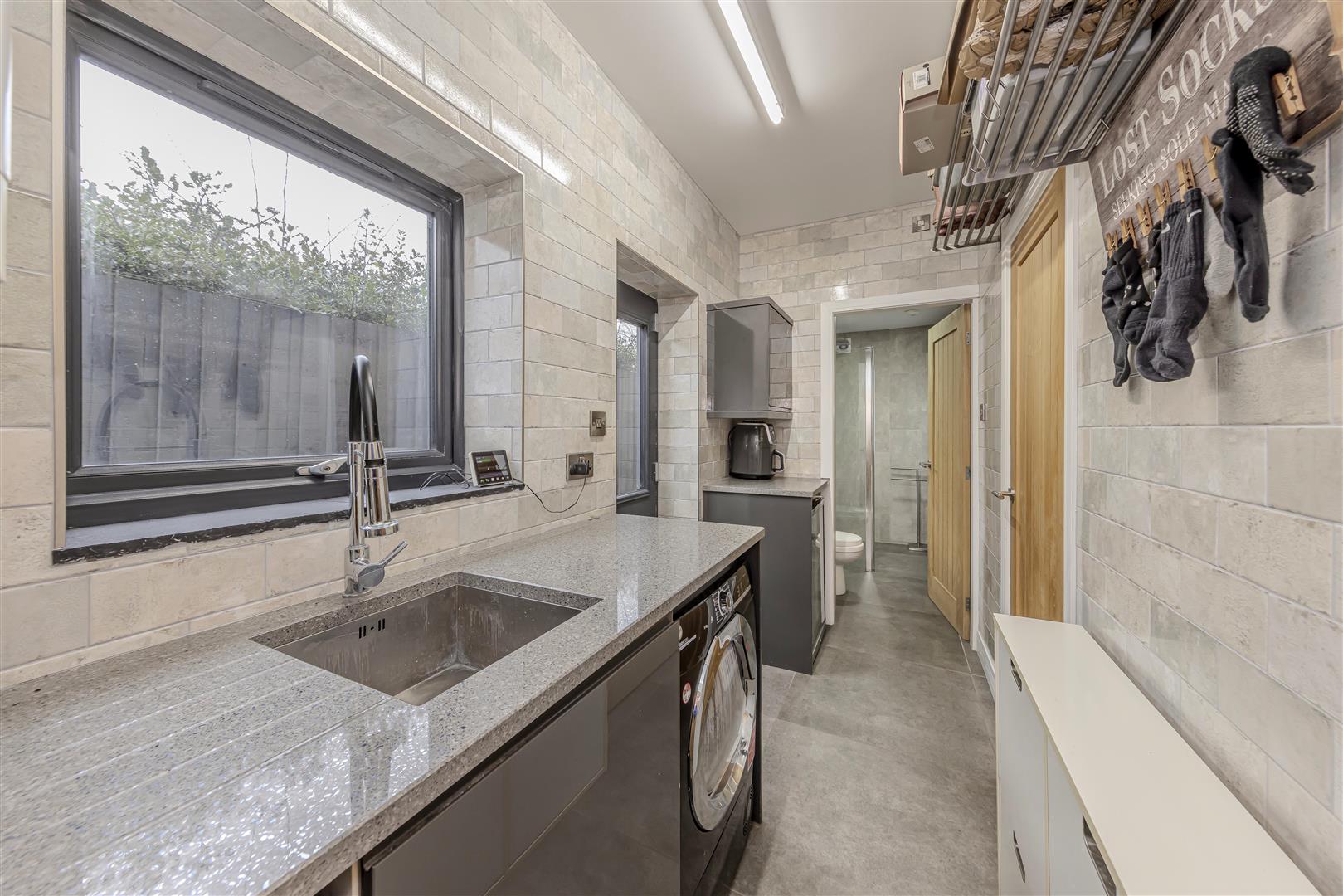 A range of gloss wall and base units with 80 mil quartz tops above with waterfall edge breakfast bar. Two UPVC double glazed windows to the rear aspect. Integrated fridge, freezer, Neff dishwasher, double oven with foldaway door and microwave and grill. Stainless steel sink and drainer unit with mixer tap above. Induction hob with Bergström extractor fan above. Two pendant lights. Access into Utility.