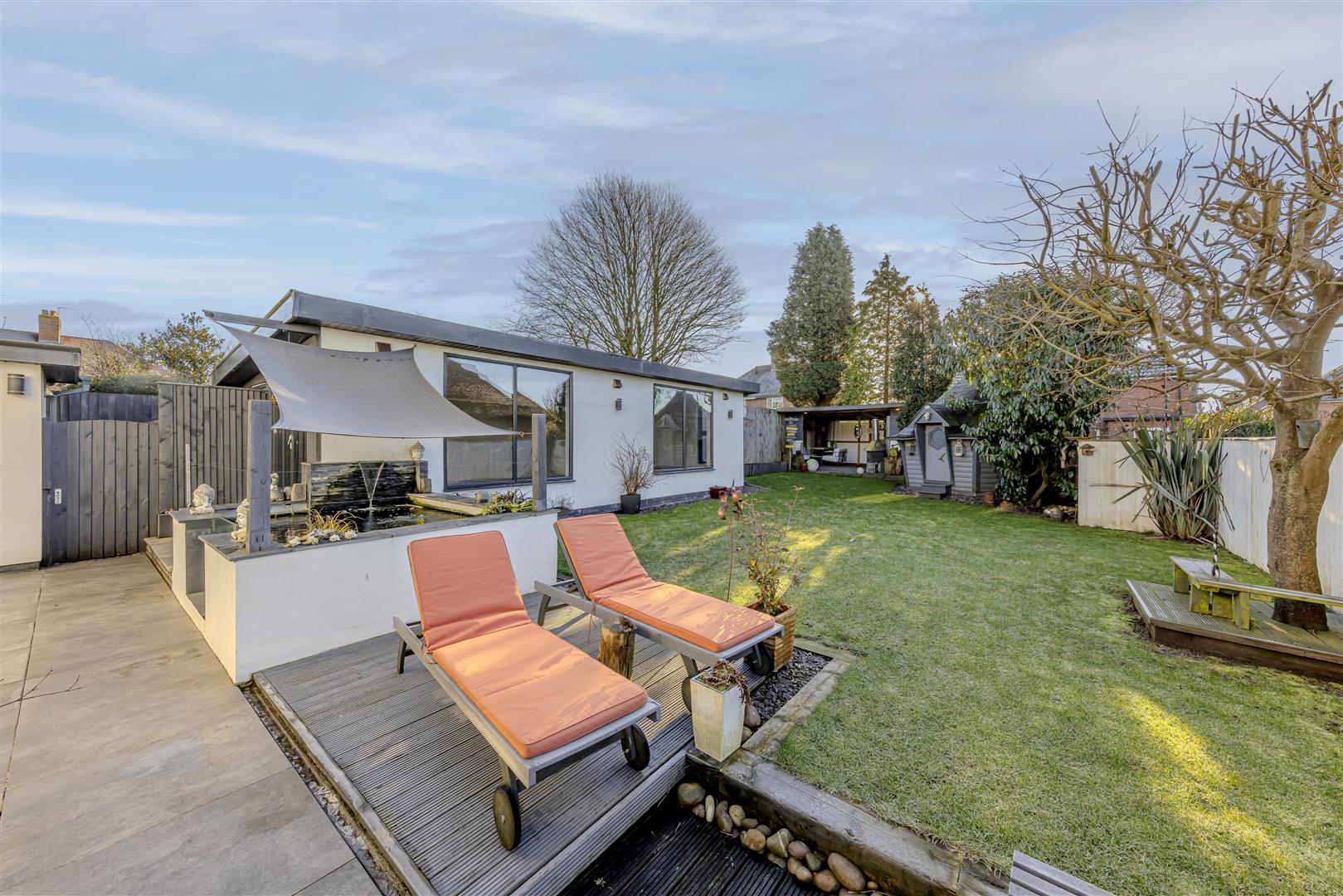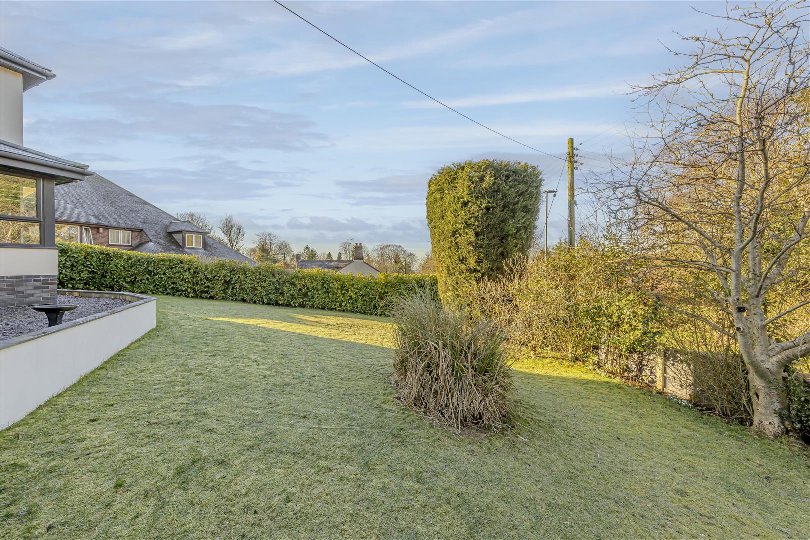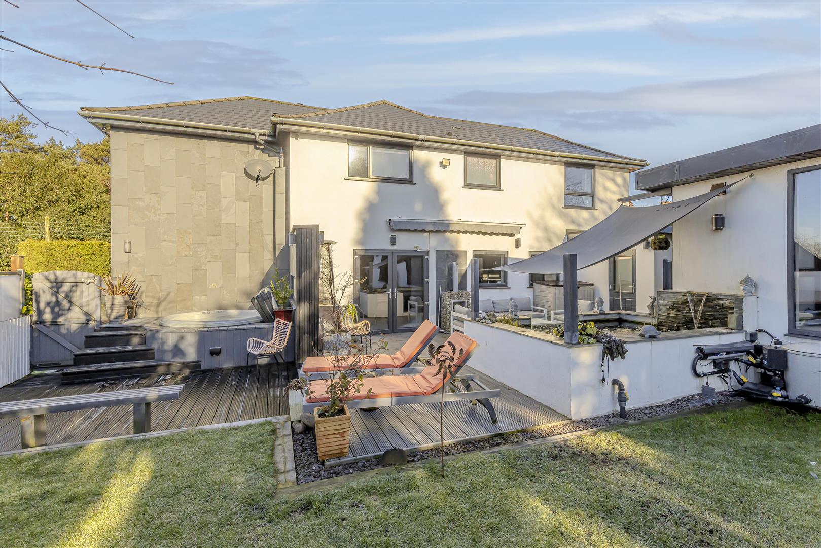 To the rear, the south-facing garden is predominantly laid to lawn and bordered by mature hedgerows, creating a secluded setting. A beautifully tiled patio and decked area provide ideal spaces for outdoor entertaining, complemented by a raised pond with glass panel and a dedicated hot tub area.