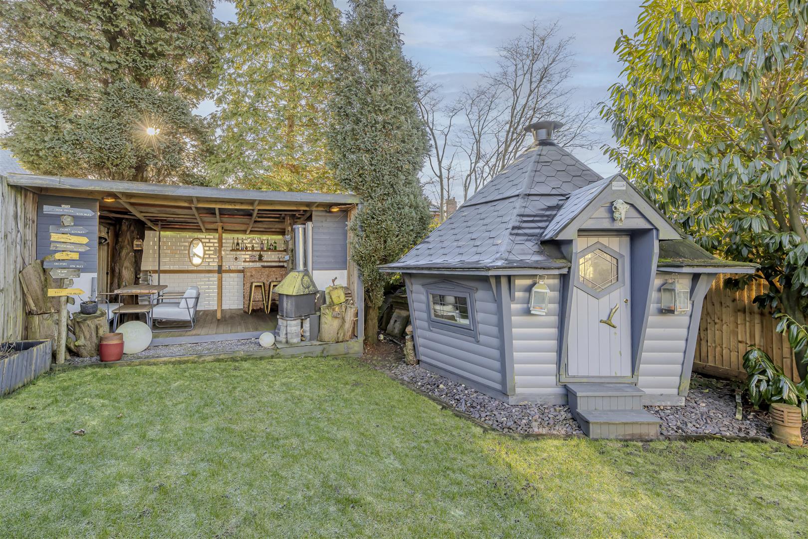 The rear garden is predominantly laid to lawn, south-facing, and bordered by mature hedgerows, providing privacy and seclusion. Additional features include a garden bar, a large workshop with access to a carport via a private road, and a charming Breeze House cabin complete with firepit.