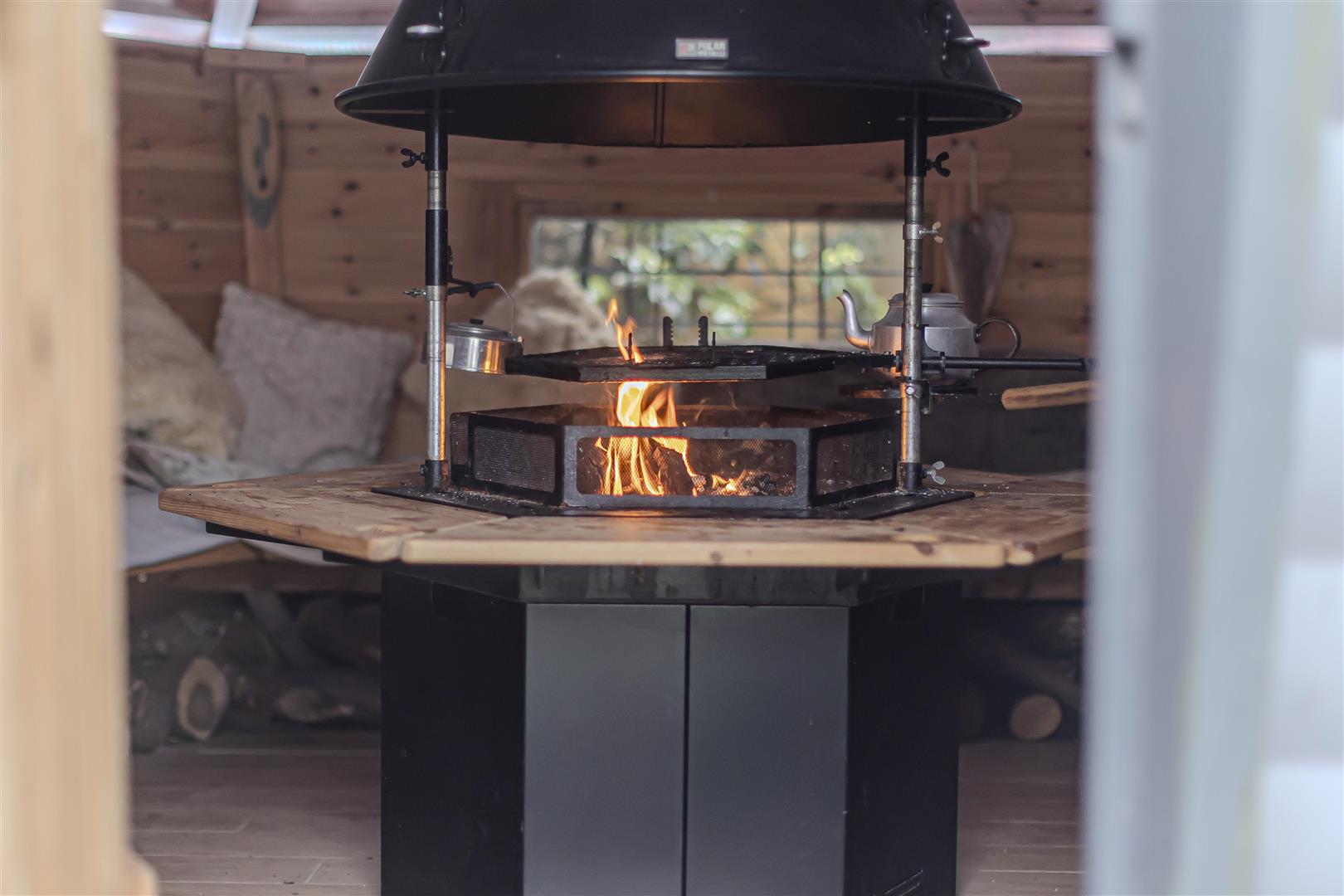 Wooden flooring. Wooden door to the front aspect. Built-seating. Firepit.