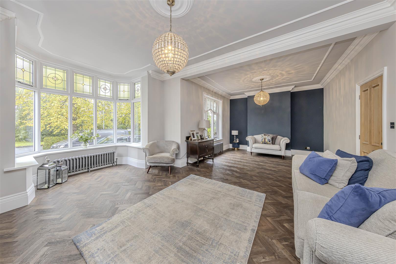 To the front of the property, an outstanding reception room spans the full width of the home. This breathtaking space is adorned with intricate coving, ceiling roses, hardwood double-glazed windows, and a multi-fuel burner—all tastefully retained or restored to enhance the property's original charm.