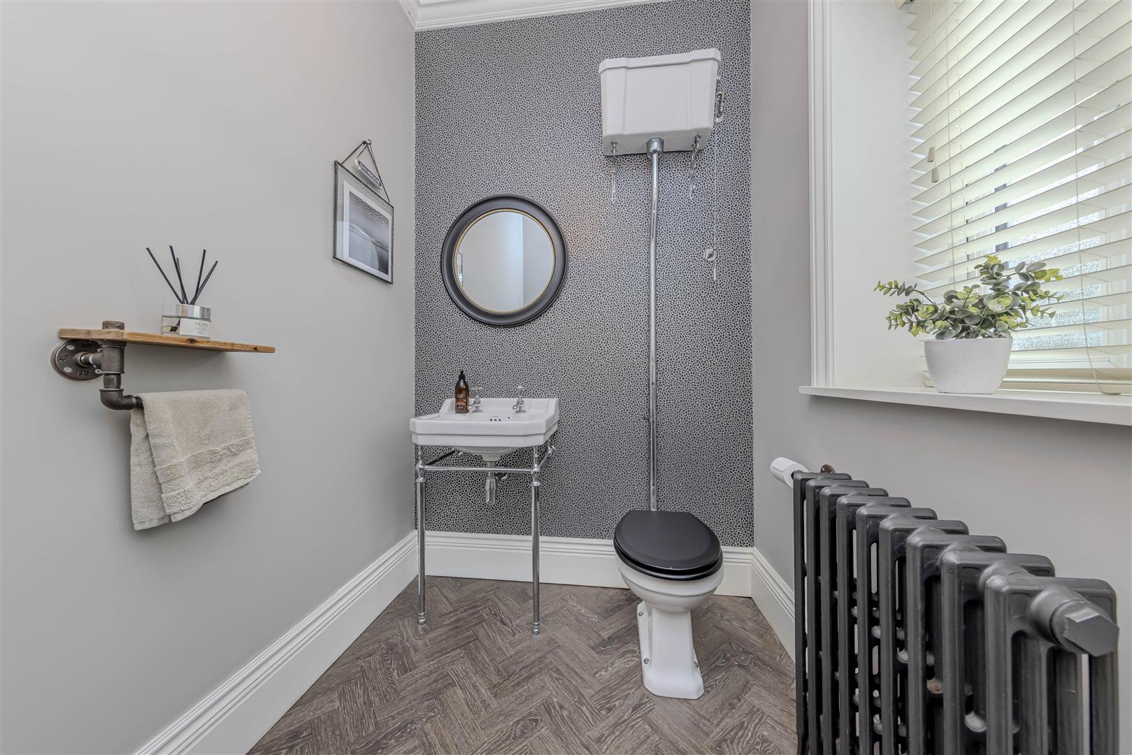 Herringbone flooring. Column radiator. Wash hand basin. WC. Coving. Obscured uPVC double glazed window to the side aspect. Ceiling light.