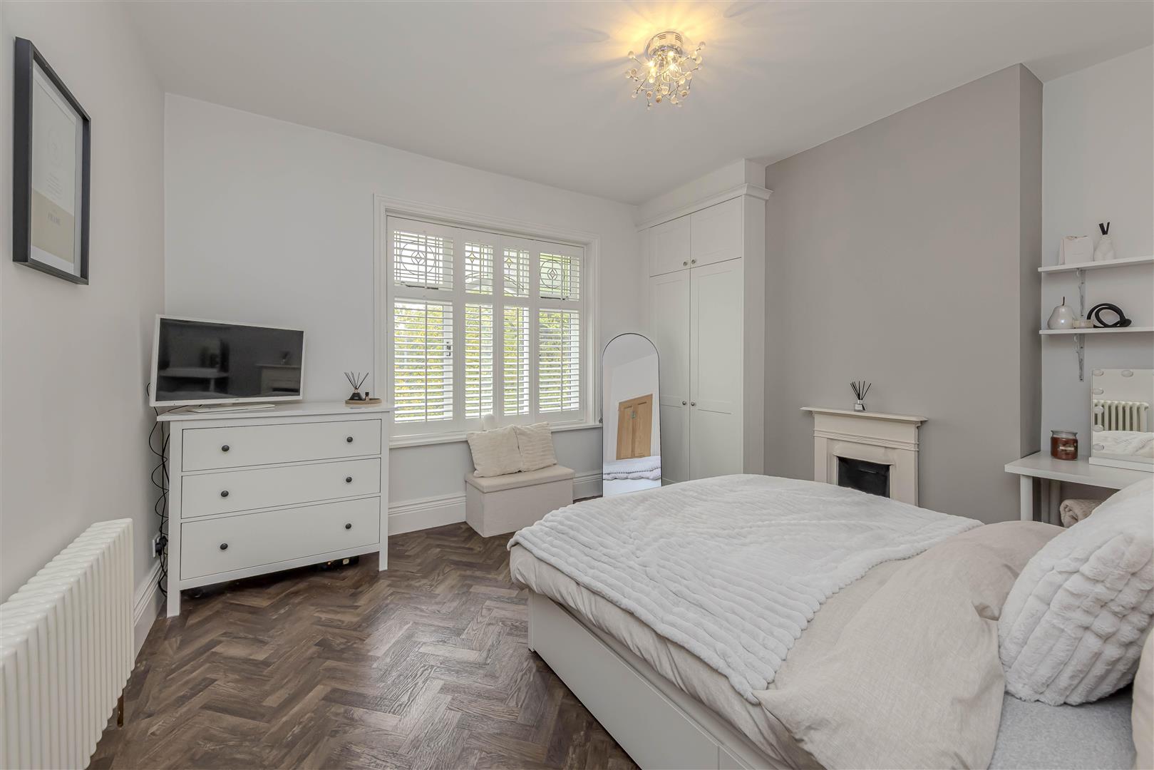 Continued herringbone flooring. Cast-iron feature fireplace. Wall mounted column radiator. Hardwood double glazed window with stained glass detail to the front aspect. Bespoke wooden shutters. Fitted wardrobes. Ceiling light.