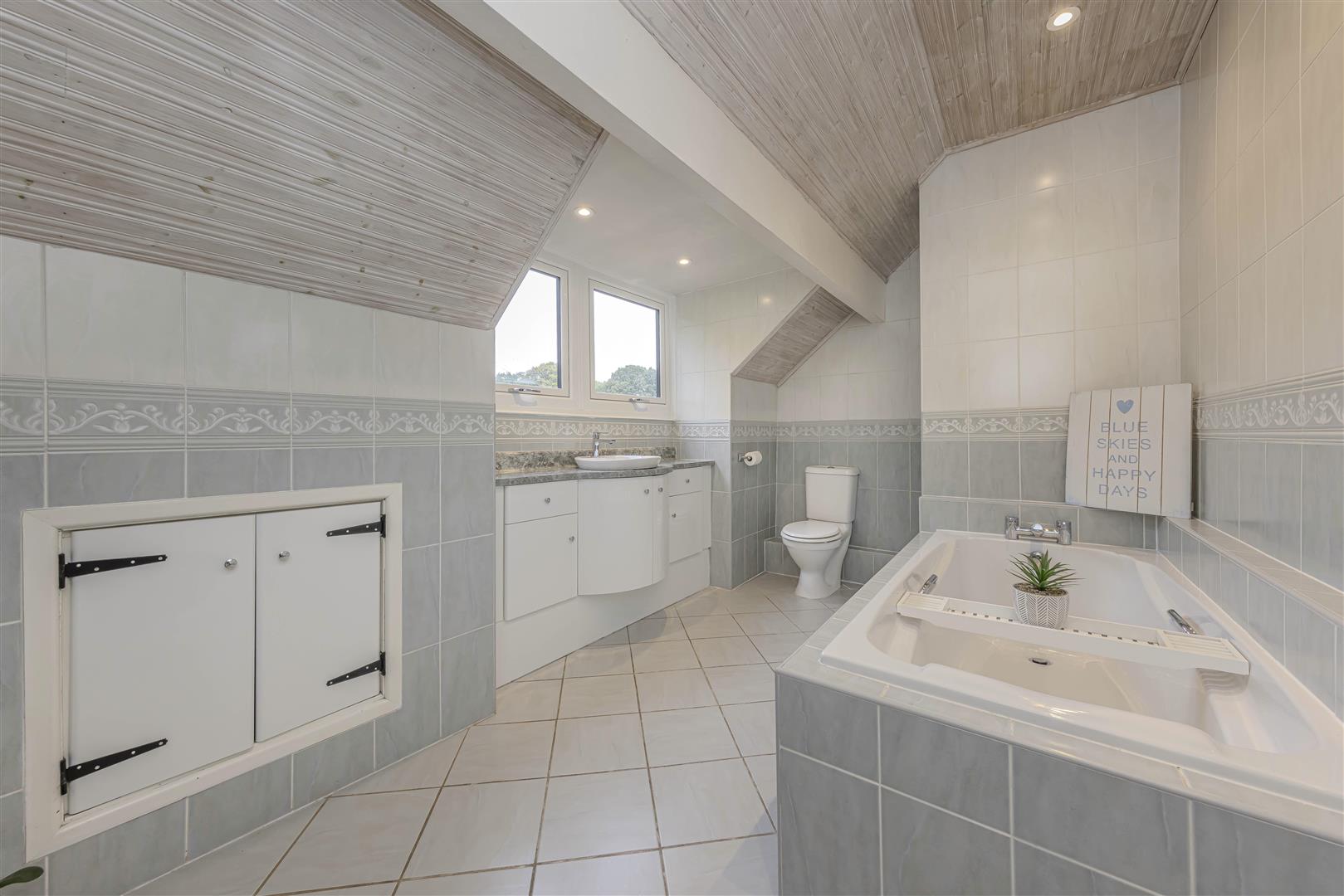 Tiled flooring. Partially tiled walls. Fitted bath. Low-level WC. Vanity unit incorporating wash handbasin with storage underneath. Wall mounted radiator. Wall mounted towel rail. Shower enclosure with shower. UPVC double glazed dormer window to the rear aspect. Inset spotlights.