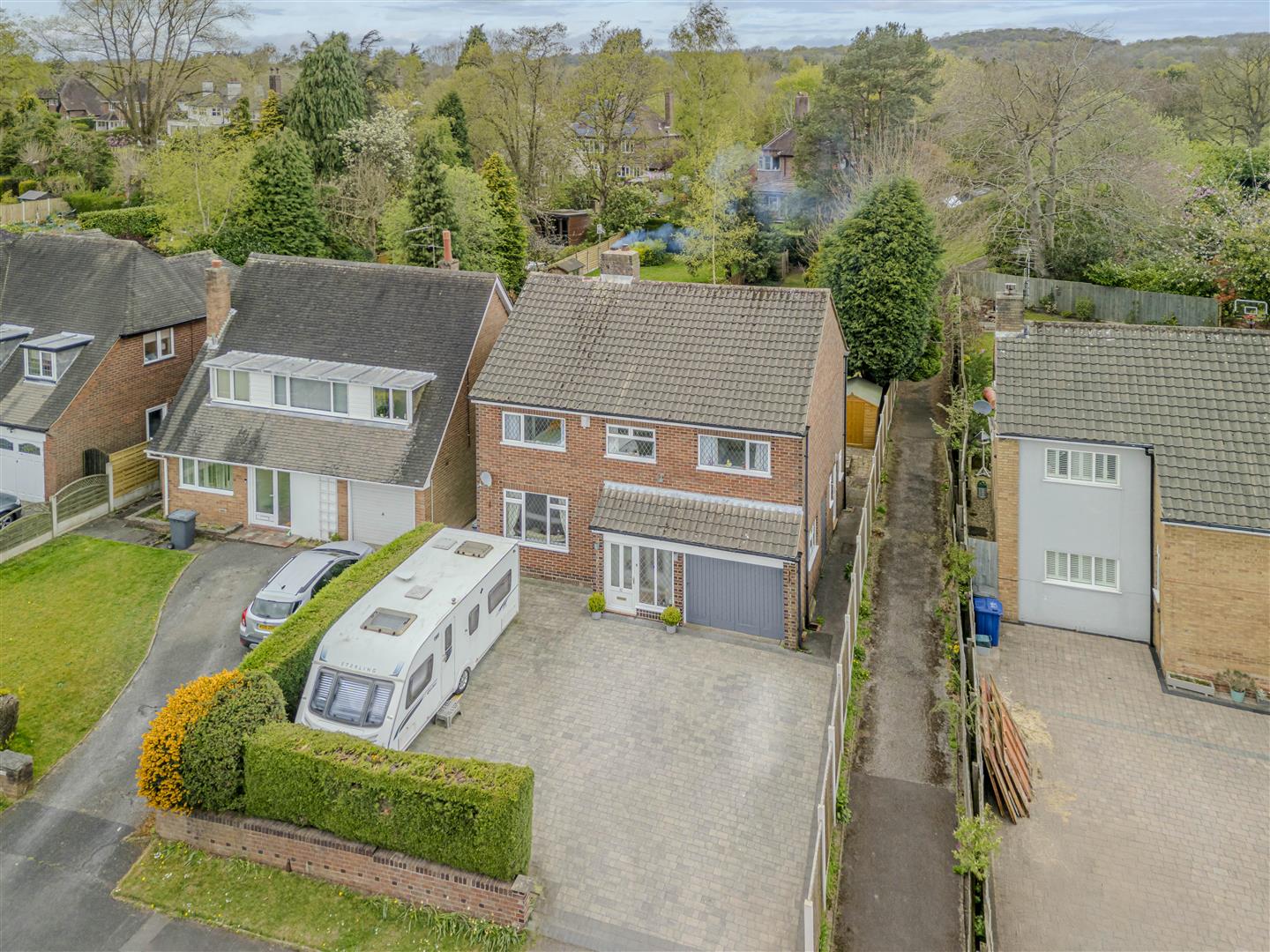 Parking is plentiful, with a spacious cobbled driveway and garage accommodating multiple vehicles, all set against the backdrop of the expansive garden to the rear.