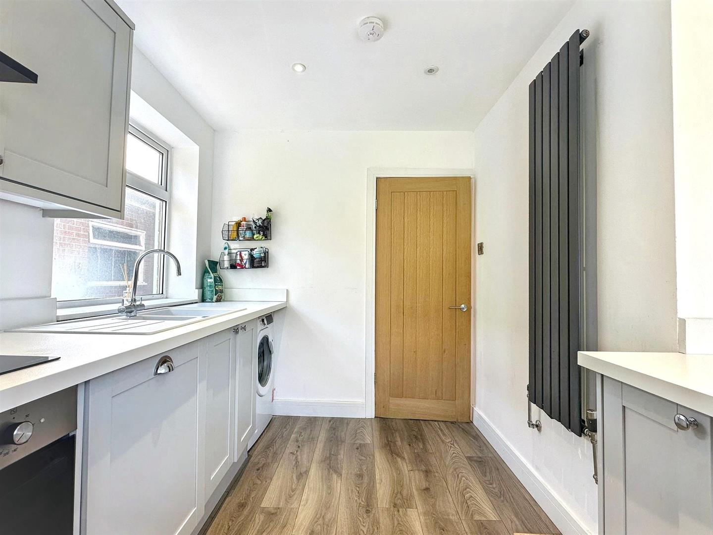 Fitted with a range of wall and base units, with works surfaces over, incorporating a double sink and drainer unit. Integrated dishwasher, oven, induction hob with extractor fan over, freezer and fridge. Plumbing for washing machine. Laminate flooring. Radiator. uPVC Windows to the rear and side aspects. Inset Spotlights.